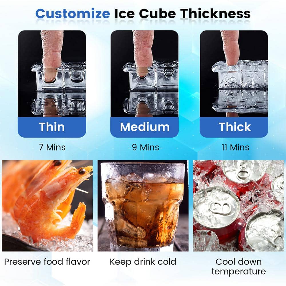 Our high efficient ice maker features 80 lbs./24h ice making capacity, 11-20 mins ice making cycle and 24 lbs. max ice storage capacity, which makes it ideal for commercial and residential use. The operation is easy through LCD control panel. You can adjust ice cube thickness in 12 levels and set the 24-hour timer. Built with thickened insulation foaming layer, this machine is able to keep ice shape for a long time. Built in self-cleaning function and drain pump, the regular cleaning and water drainage is convenient and effortless. This freestanding ice machine can be used under counter, and the reversible door can be installed to the right or left side according to your need.