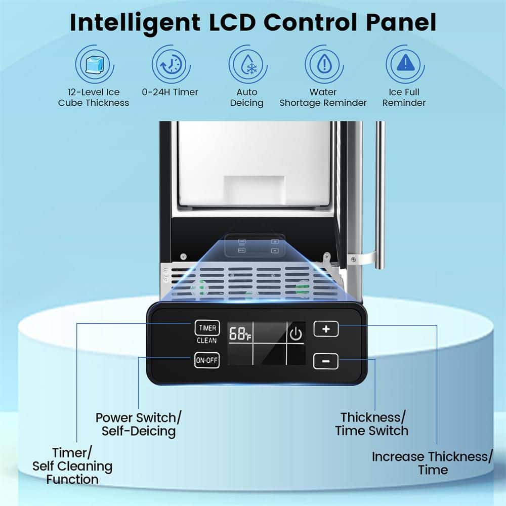Our high efficient ice maker features 80 lbs/24h ice making capacity, 11-20 mins ice making cycle and 24 lbs max ice storage capacity, which makes it ideal for commercial and residential use. The operation is easy through LCD control panel. You can adjust ice cube thickness in 12 levels and set the 24-hour timer. Built with thickened insulation foaming layer, this machine is able to keep ice shape for a long time. Built in self-cleaning function and drain pump, the regular cleaning and water drainage is convenient and effortless. This freestanding ice machine can be used under counter, and the reversible door can be installed to the right or left side according to your need. To enjoy the ice at its freshest, please use up ice in the basket or put it in the fridge to avoid melting around.