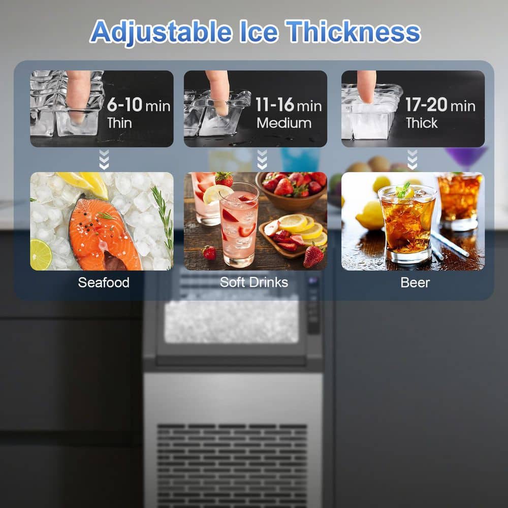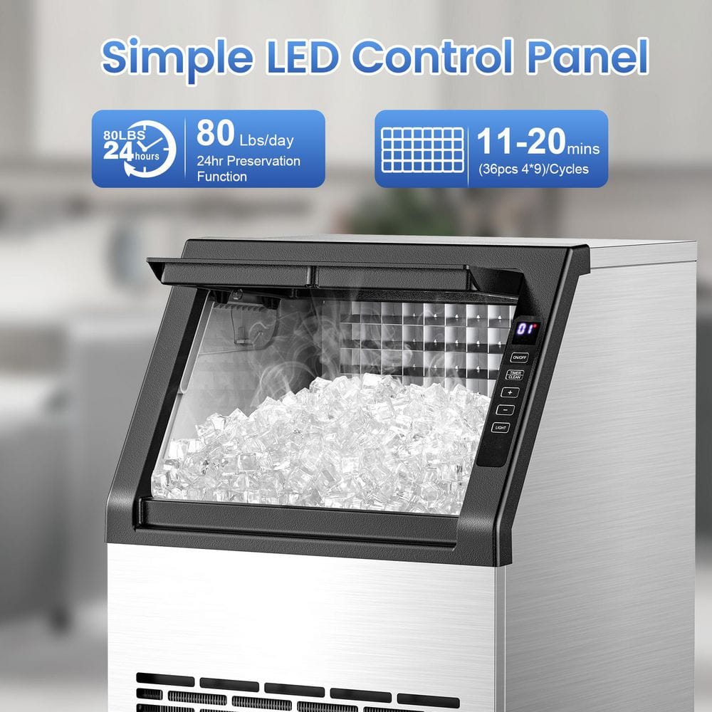 Experience powerful, efficient ice production with the COWSAR Commercial Ice Machine, engineered to deliver professional performance in any setting. Its robust compressor rapidly generates 36-cubes in just 11-20 minutes and up to 80 lbs. of ice daily, ensuring high-volume output without compromise. Control every detail effortlessly via the intuitive LCD panel-adjust ice thickness, set timers, or activate cleaning cycles with a touch. Designed for versatility, this energy-efficient unit operates quietly and fits seamlessly under counters or stands freely in kitchens, bars, offices, or entertainment spaces. With a 22 lb. storage capacity (transfer ice to a freezer for extended storage) and space-saving design, COWSAR combines reliability, user-friendly operation, and commercial-grade results for both businesses and homes.
