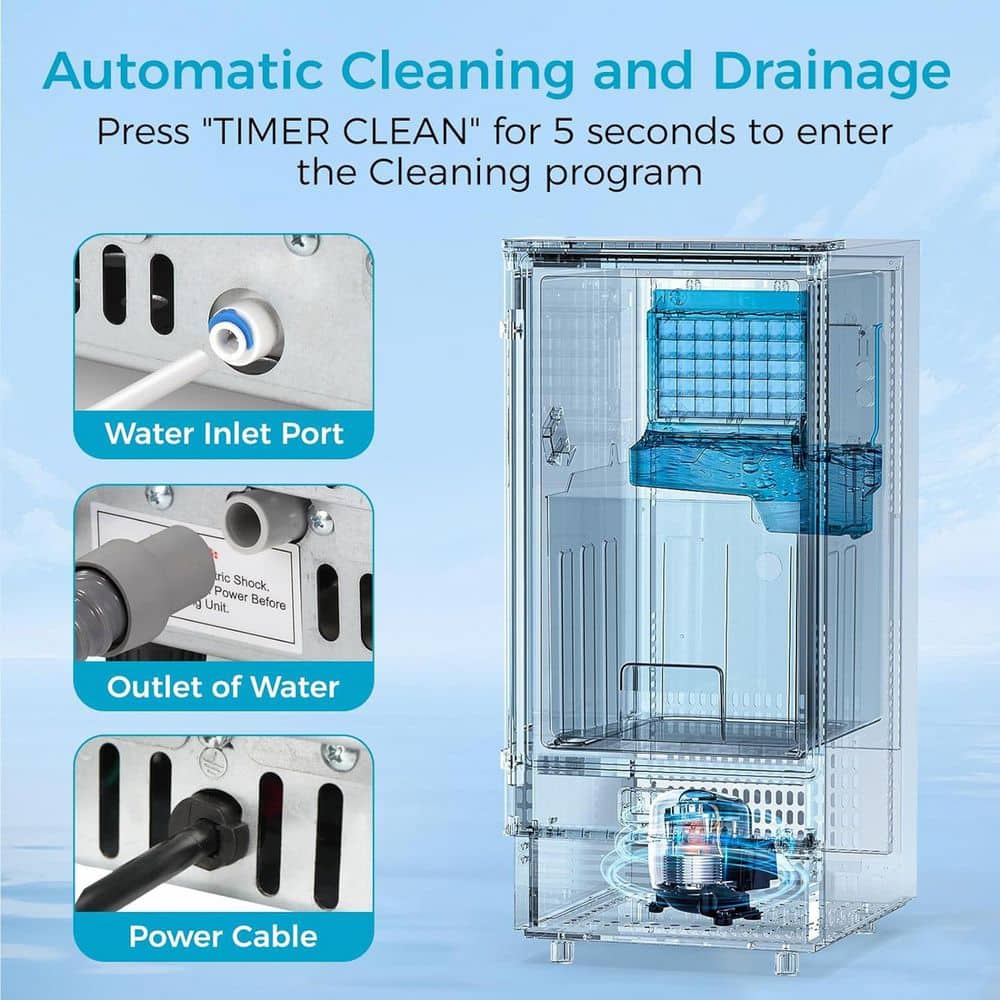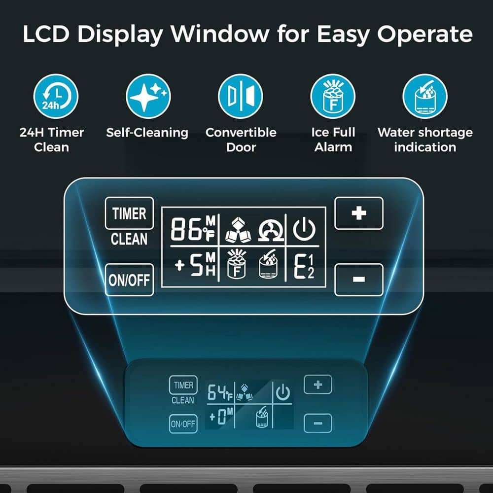 This ice machine is ideal for both home and commercial use. It produces 80 lbs. of ice daily, with each cycle taking just 11 - 20 minutes for quick access. An intuitive LCD panel lets you customize ice cube size-thin, medium, or large. Its 25 lbs. ice basket and 6-hour frozen storage keep ice fresh. A 360° automatic cleaning function simplifies maintenance, while the 3-layer insulated housing preserves ice quality. Compact, stylish, and easy to install thanks to adjustable feet and a reversible door, this energy-efficient machine delivers reliable, hassle-free ice production.