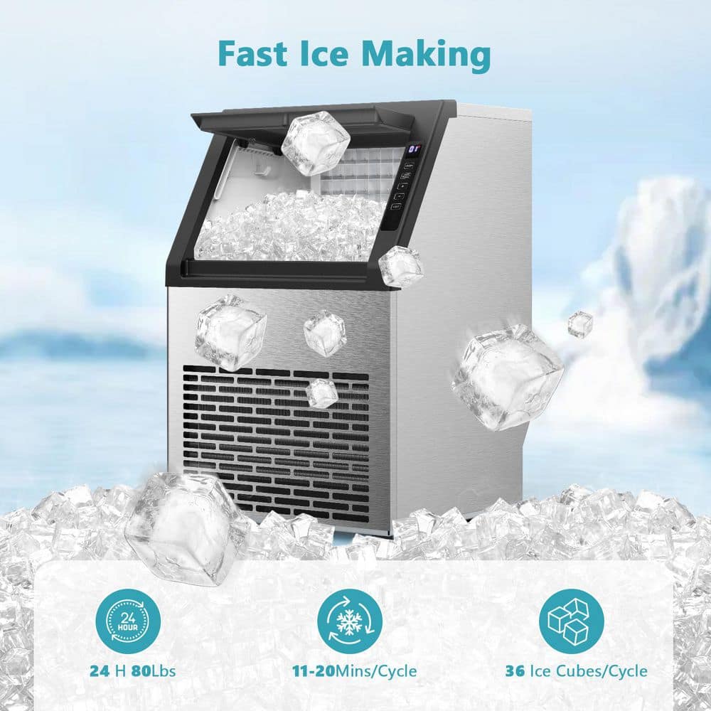 - Produces 36 cubes in 11 minutes and 80 lbs. of ice per day