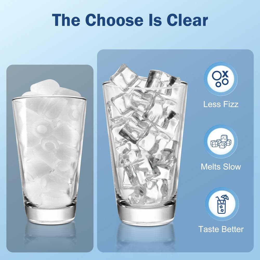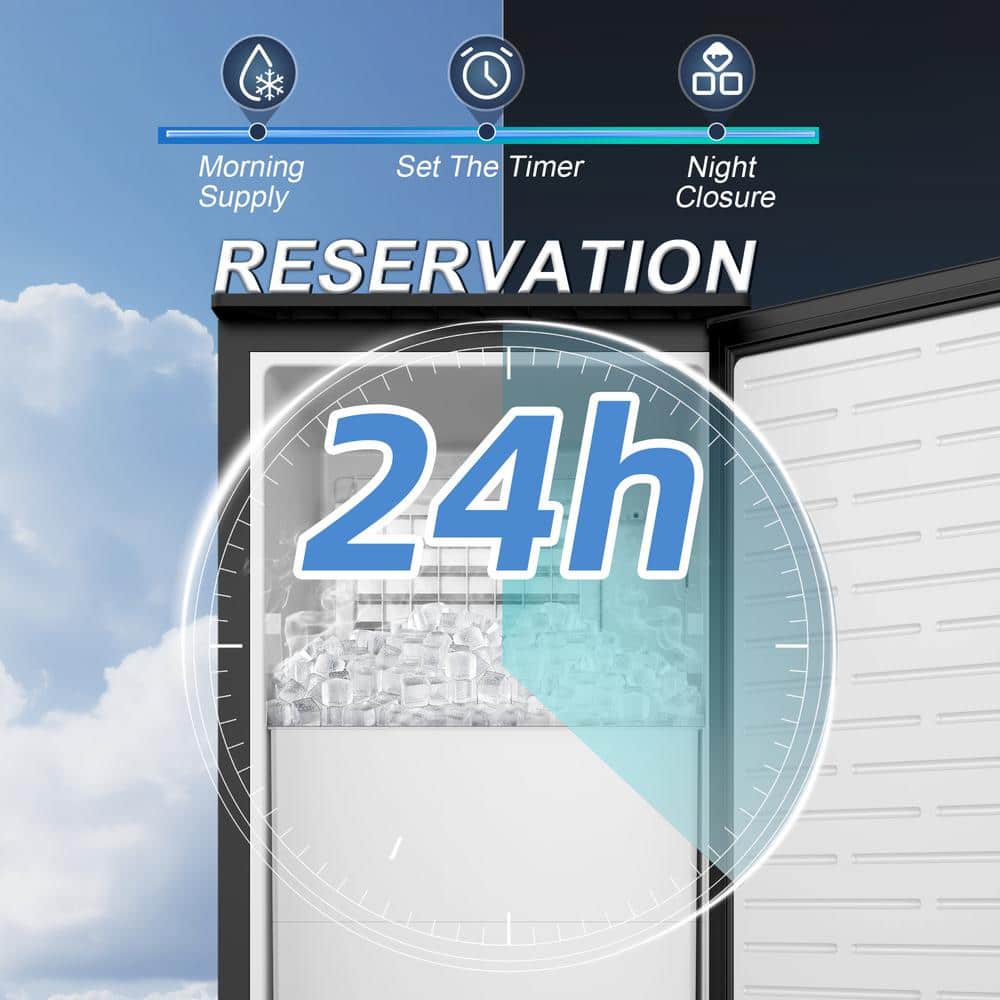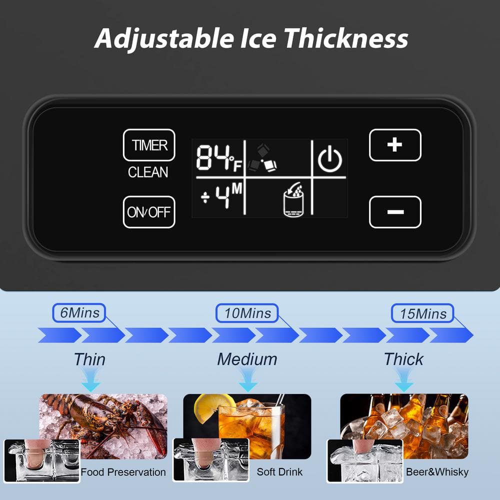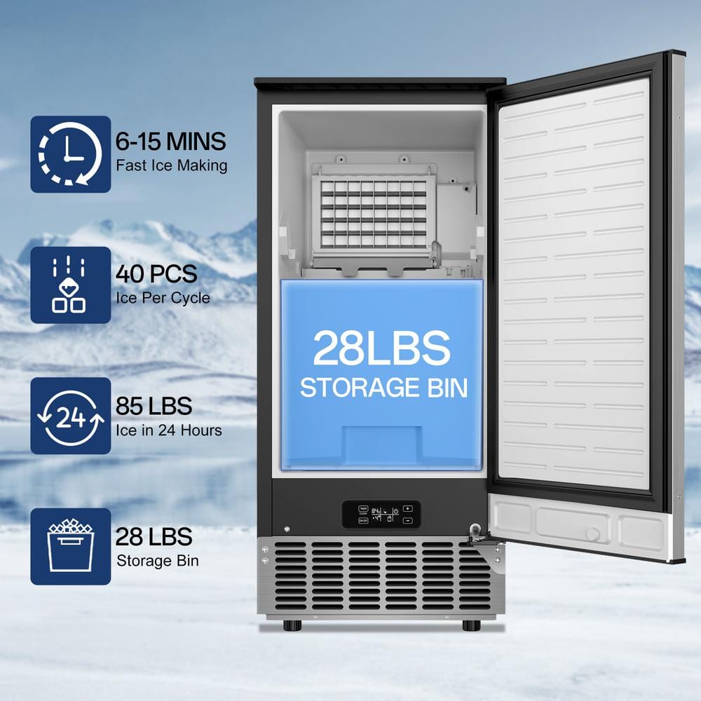 Our commercial counter ice maker is designed to produce up to 85pounds of ice in 24 hours, providing you and your family with 40 clear ice cubes every 6-15 minutes. The 28-pound storage bin ensures a steady supply of ice, meeting the daily demands of your needs.The multifunctional control panel features an LCD display that shows the ambient temperature and allows you to adjust the ice thickness by modifying the ice-making time.With the 24-hour timer function, you can conveniently set the machine to start or stop as needed.This ice maker includes an automatic cleaning function-simply press the "scheduled cleaning" button.Constructed with three layers: a solid zinc plate, a thickened foam layer, and a food-grade ABS liner, providing excellent thermal insulation. When the ice basket is full, the ice maker automatically stops and keeps the ice cubes at a low temperature for 10-12 hours.Offers flexible and convenient installation by allowing you to easily adjust the handle direction to fit your space.Gravity-driven drainage systems rely on natural flow, offering consistent and reliable water removal without the risk of pump failures.Its compact size makes it suitable for any standard-height kitchen or bar and allows it to be used as a standalone unit. You can install this machine wherever you need it-in your kitchen, living room, outdoor yard, or even on a yacht.