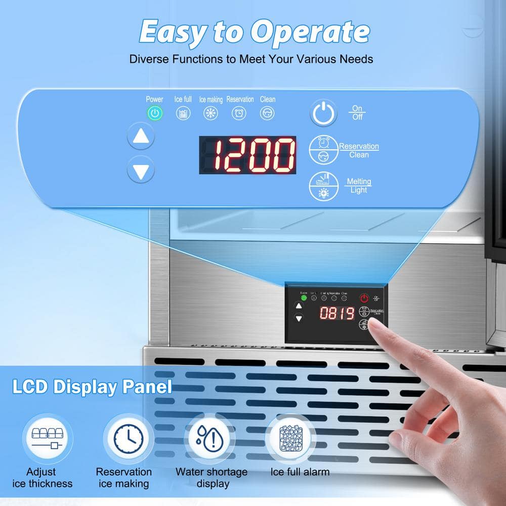 Upgrade your ice-making with our high-performance commercial ice maker, producing up to 95 lbs of ice daily. Get 40 clear ice cubes every 6-15 minutes, stored in a spacious 35-lb storage bin. The LCD panel lets you adjust ice thickness, monitor temperature, and set a 24-hour timer. Enjoy easy maintenance with automatic self-cleaning at the press of a button. Built with durable zinc, foam insulation, and food-grade ABS, it keeps ice chilled for 12 hours. Compact and versatile, it fits under counters, freestanding spaces, or even yachts. Perfect for homes, bars, and events-reliable, stylish, and efficient.