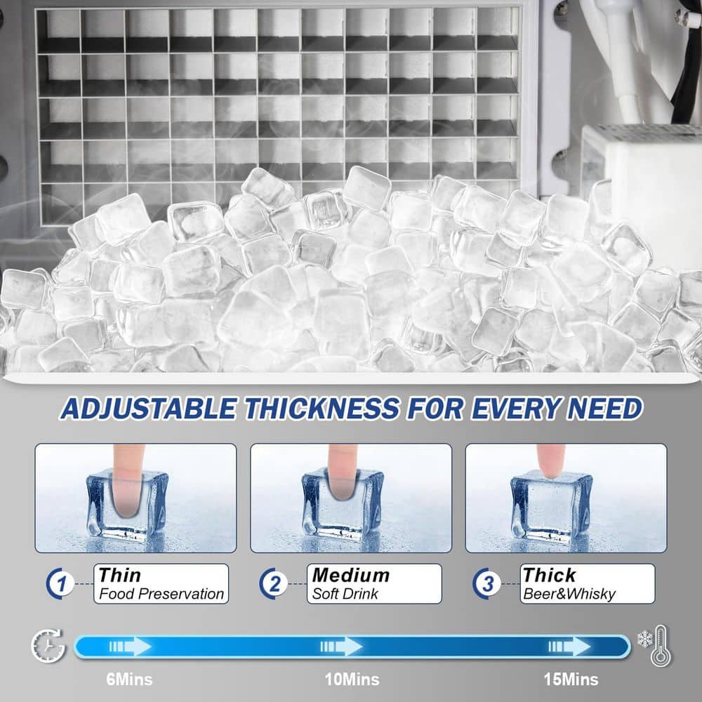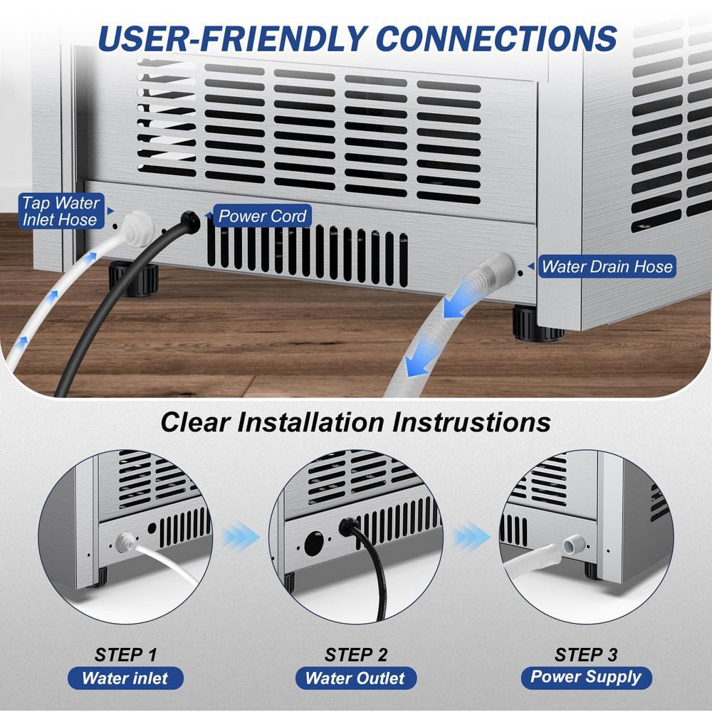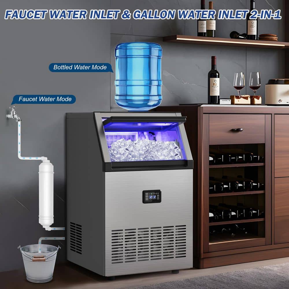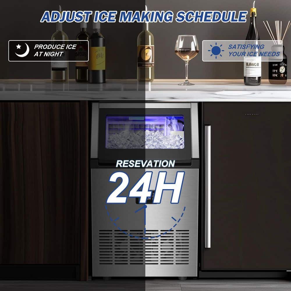 Looking for a reliable, high-output ice solution for your business Our Commercial Ice Maker Machine delivers up to 170 lbs. of crystal-clear ice every 24 hours, with each 11-15 minute cycle producing 55 dense, chewable cubes-perfect for bars, restaurants, hotels, and busy kitchens. With a spacious 40 lbs. storage bin, you'll never run short, even during peak hours. Engineered for durability, this unit features a heavy-duty stainless steel body, a food-grade liner, and thickened insulation to keep ice frozen for up to 9 hours, even in power outages. The 750-Watt high-efficiency compressor with R290 refrigerant ensures quiet operation, rapid cooling, and low energy use, saving you money while keeping up with demand. The intelligent LCD panel offers 1-touch control over thickness, timer, cleaning, and alerts like full-bin or water-shortage. It even includes a premium water filter, drainage pipe, and ice scoop-everything you need right out of the box. Elevate your business with a cleaner, faster, smarter way to make ice.