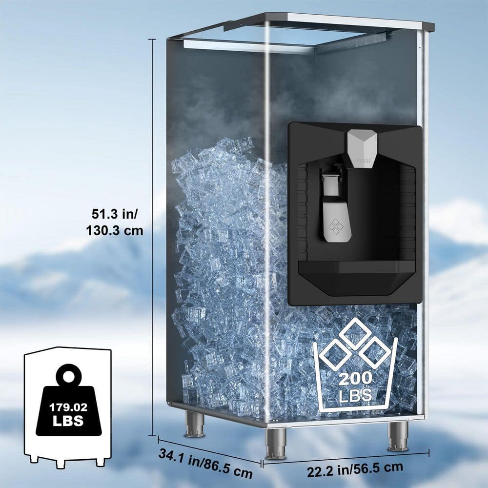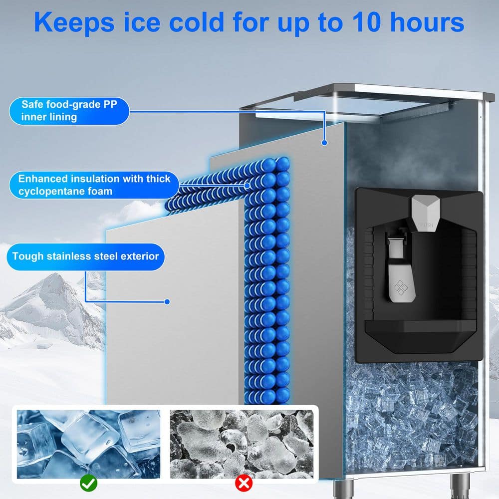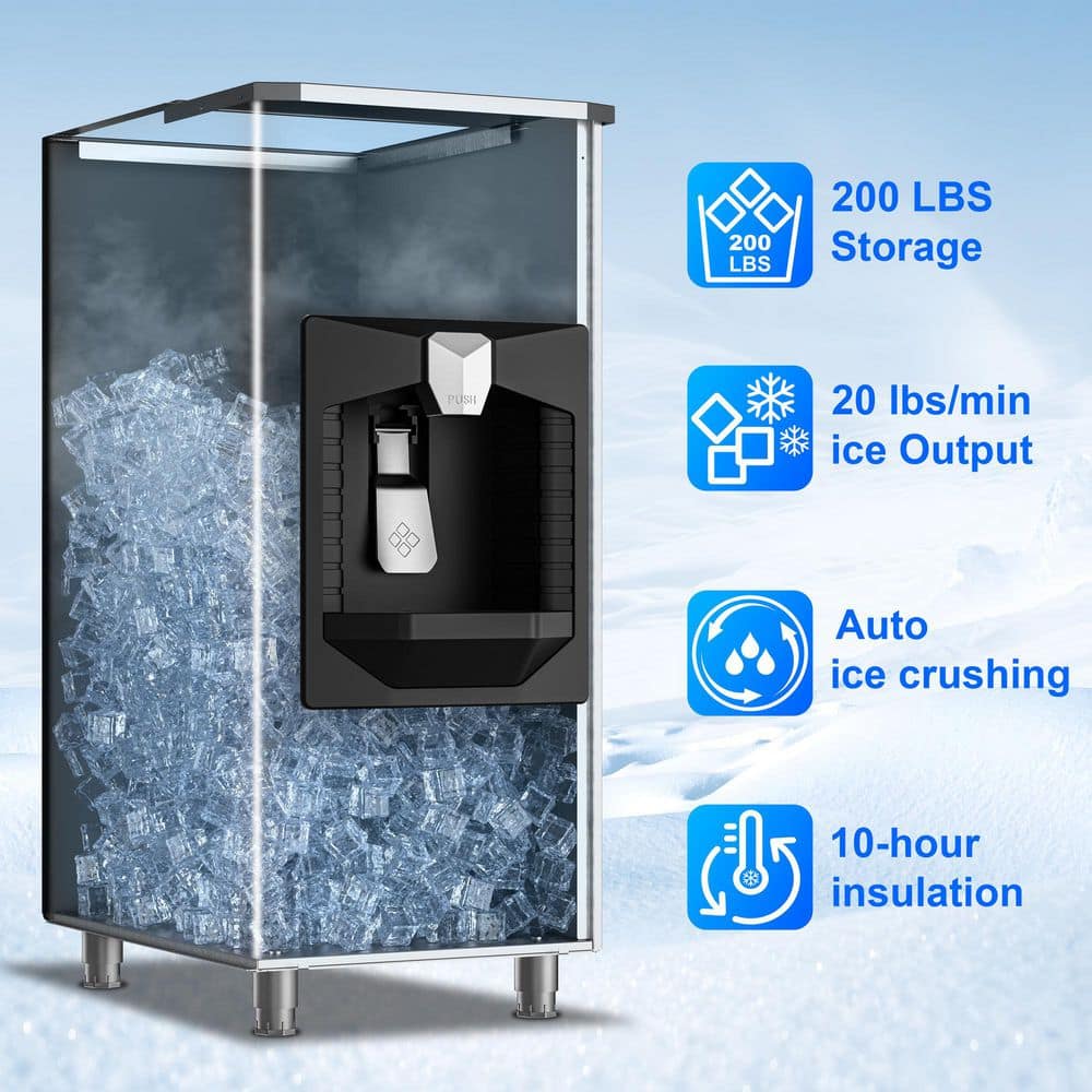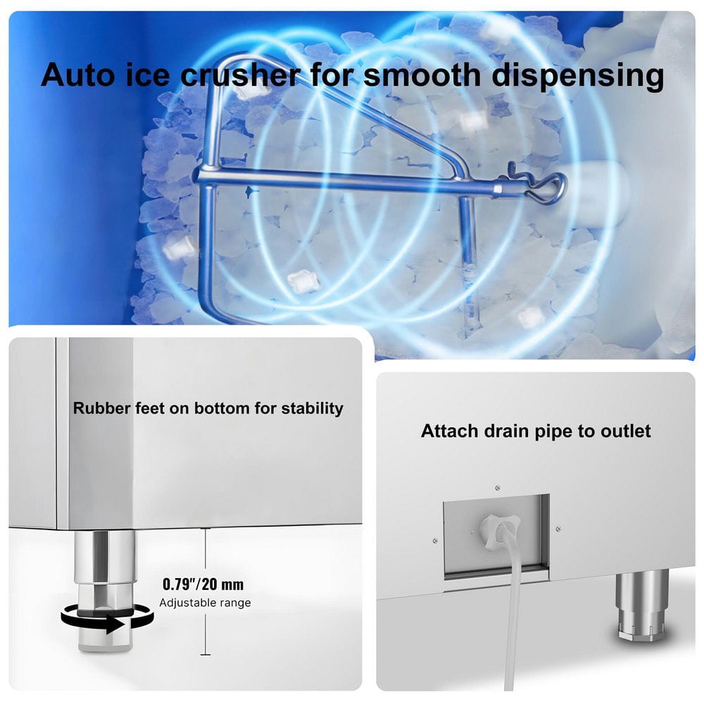 Upgrade your ice service with this professional-grade commercial ice maker Bin (ice storage bin), designed to meet the demands of busy restaurants, bars, cafes, and event venues. With a massive 200 lbs / 91 kg ice storage capacity, you'll always have a ready supply of ice on hand, ensuring fast, seamless service even during peak hours. The automatic ice dispenser delivers up to 20 lbs / 9 kg of ice per minute-simply press for a small amount or push the bucket for a larger portion-while the built-in crusher prevents jams by breaking down cubes effortlessly. Featuring ≥25mm thick cyclopentane foam insulation and heavy-duty stainless steel construction, ice stays solid and fresh for 6-8 hours, even during power outages. Adjustable, non-slip rubber feet provide stability and protect your floors, while gravity drainage ensures clean, drinkable ice every time. Customize ice thickness for cocktails, sodas, or any beverage with ease, and enjoy worry-free operation with durable, professional-grade materials built to last. From hosting large events to keeping up with daily business demands, this ice maker Bin delivers convenience, reliability, and continuous ice supply, making it the ultimate upgrade for any high-demand setting.-Includes only the ice storage bin