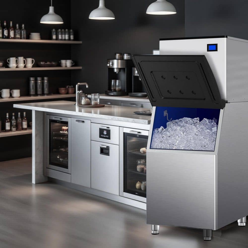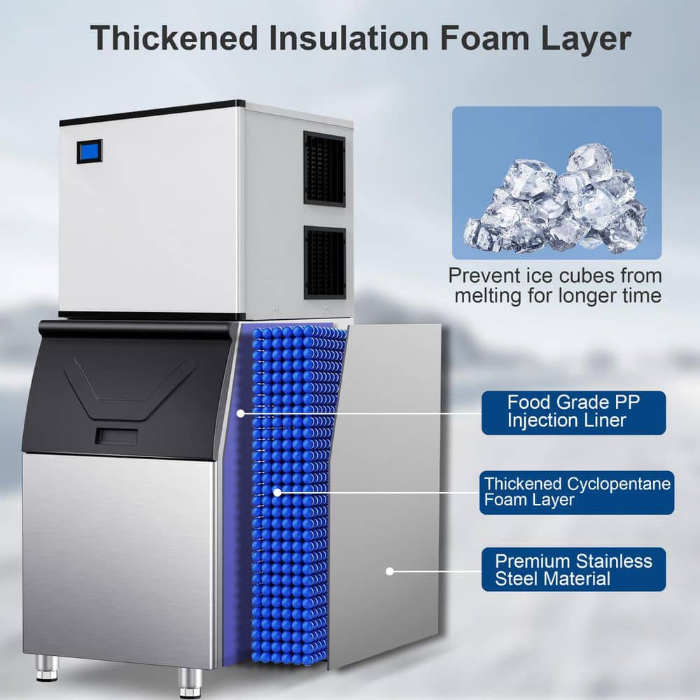 - Large 500 lbs bin stores ample ice to meet peak demand easily