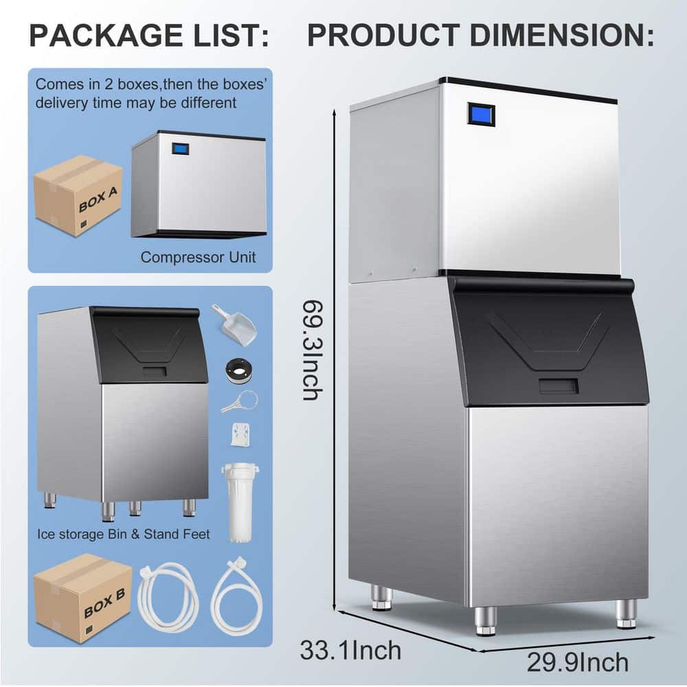 Built for performance and reliability, this 30.1 in. 800 lb. Commercial Ice Maker is the perfect solution for high-demand settings like restaurants, bars, hotels, and event venues. With a powerful 1800W compressor, it produces 340 ice cubes every 8-15 minutes, generating up to 800 lbs of ice in 24 hours. The spacious 500 lb storage bin keeps plenty of ice ready, even during peak hours.Designed with convenience in mind, the LCD touch panel allows you to easily adjust ice thickness, set 1-24 hour production cycles, and monitor full ice or water shortage alerts. The built-in self-cleaning mode and automatic drainage system ensure hassle-free maintenance.Made from durable stainless steel and insulated with food-grade PP and cyclopentane foam, this machine keeps ice frozen longer while standing up to commercial use. The split unit design with sturdy feet offers flexible installation in any space. With ETL certification, included accessories, and a 1-year warranty with lifetime tech support, this ice maker delivers unbeatable value and performance-ideal for businesses and large households alike.