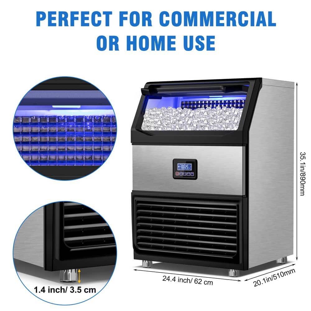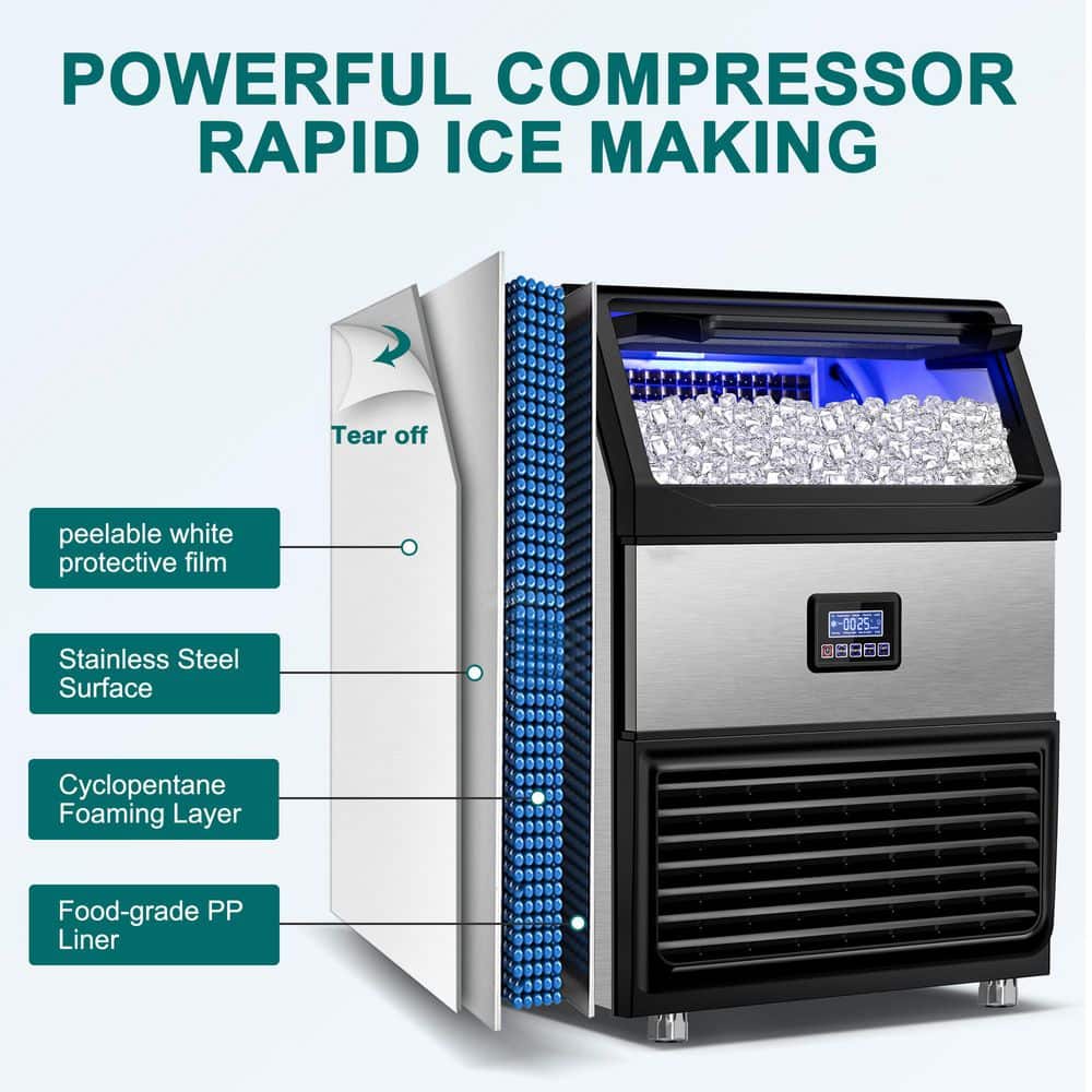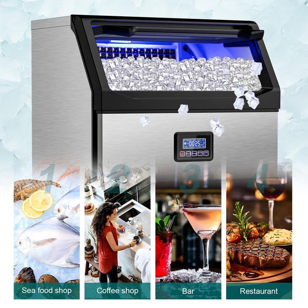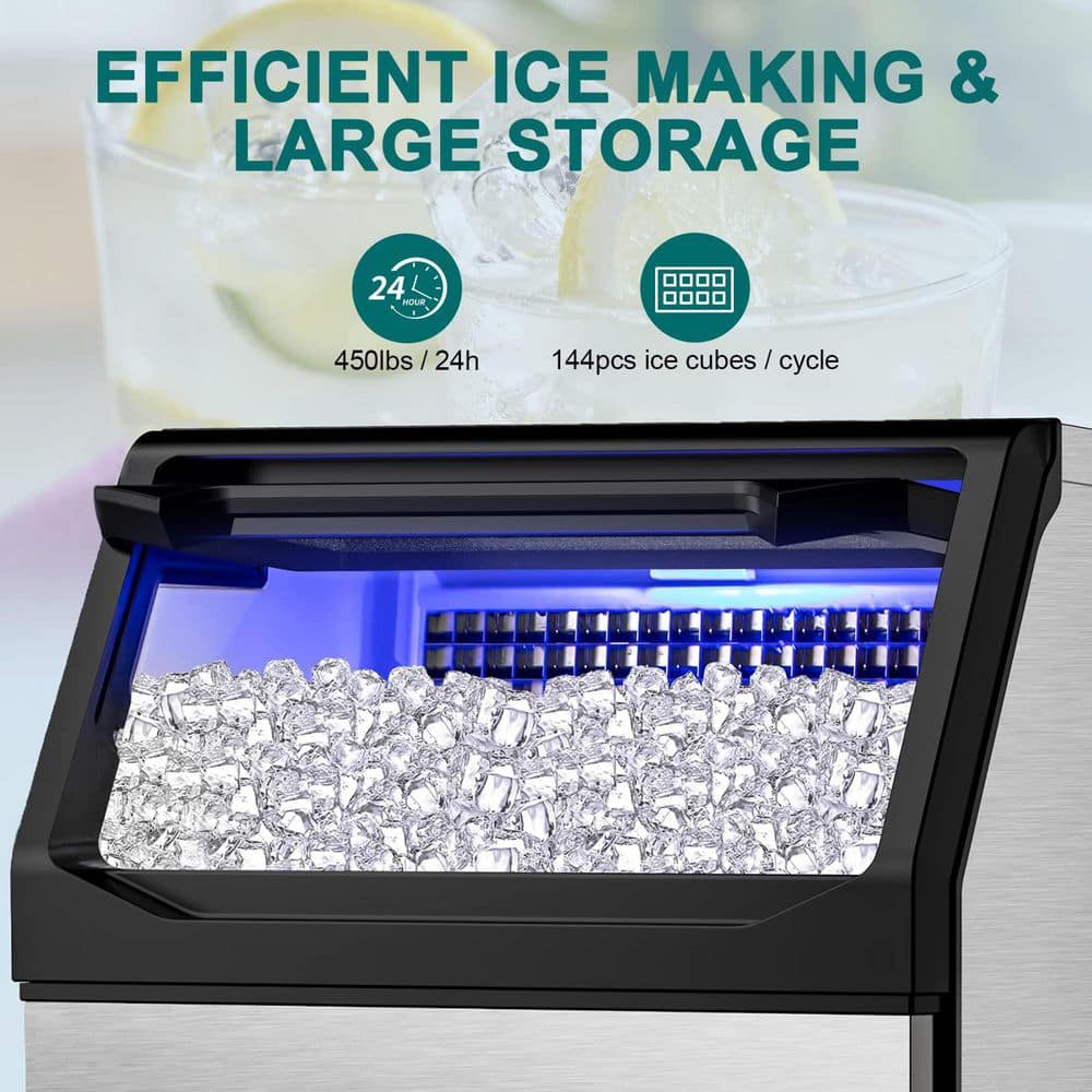 Meet the powerhouse built for serious business-our 450LBS/24H Commercial Ice Maker. Designed for bars, restaurants, hotels, and high-demand venues, this machine delivers up to 144 crystal-clear cubes every 8-15 minutes and an impressive 450lbs of ice per day. With a 77lb storage bin, you stay stocked even at peak hours-no more ice shortages, no more delays, just nonstop service.Crafted from durable stainless steel with a food-grade liner and thick insulation, your ice stays clean, fresh, and slow-melting. The high-efficiency 750W compressor and R290 refrigerant ensure rapid freezing with lower noise and reduced energy consumption, helping your business save money every day. The built-in premium water filter turns tap water into pure, cloudless ice that customers love-perfect for cocktails, soft drinks, buffets, and more.Operation is effortless with an intelligent LCD control panel featuring auto-clean, defrost, ice-full alerts, timer settings, and customizable ice thickness. One touch keeps everything running smoothly, hygienically, and efficiently. Whether you're serving 50 guests or 500, this machine works as hard as you do.If your business depends on ice, don't settle for less. Choose power, speed, and reliability-your bar, restaurant, or event space will thank you.