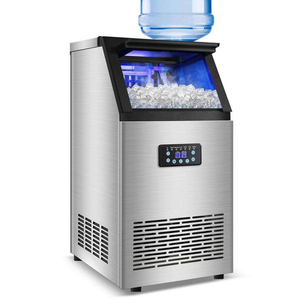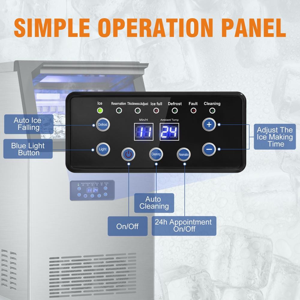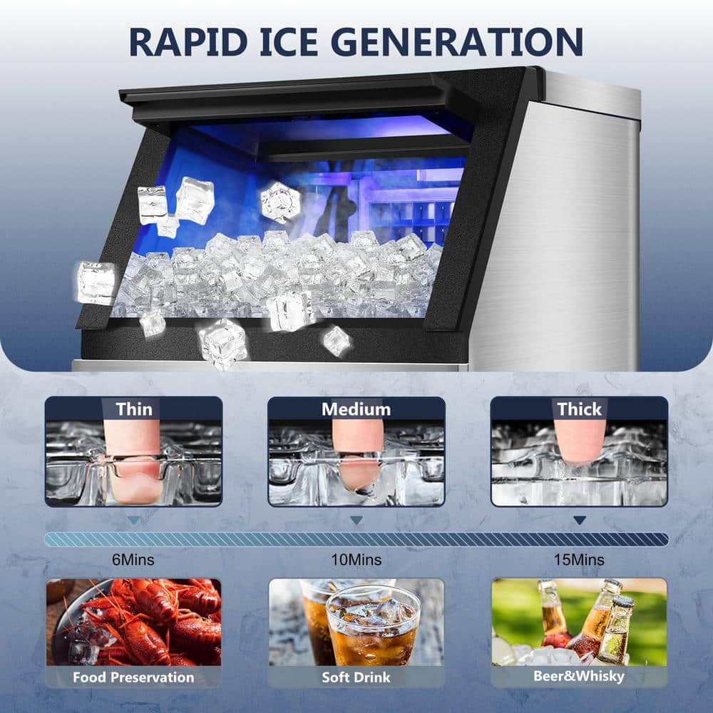 Introducing the SOZT Commercial Ice Maker Machine,With a robust production capacity of 120 lbs. per day and a spacious 30 lbs. storage bin, ensures a steady supply of ice.This commercial ice maker accommodates both tap water and top loading, ensuring you have crystal-clear ice every time. The included water filter enhances the clarity and taste of the ice.Featuring a state-of-the-art CFC-free compressor, this ice machine operates quietly while reducing energy consumption by up to 30%. It can churn out 40 clear, hard ice cubes in just 6 to 15 minutes per cycle. With thicker insulation layer, your ice remains frozen for 8 to 24 hours.Versatile Functionality - The freestanding ice maker comes with an intuitive control panel offering adjustable ice cube thickness, one-touch auto cleaning, 24-hour reservations, defrosting, and alerts for malfunctions and water shortages.User-Friendly Design - This freestanding unit is easy to set up, featuring four adjustable screw-in feet to level the machine on uneven floors. Its compact size fits seamlessly into tight spaces, making it ideal for bars, restaurants, homes, and offices.