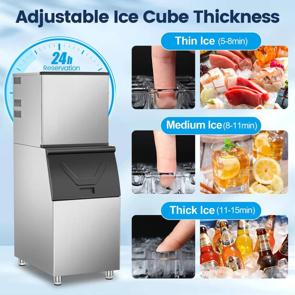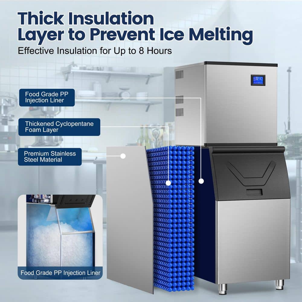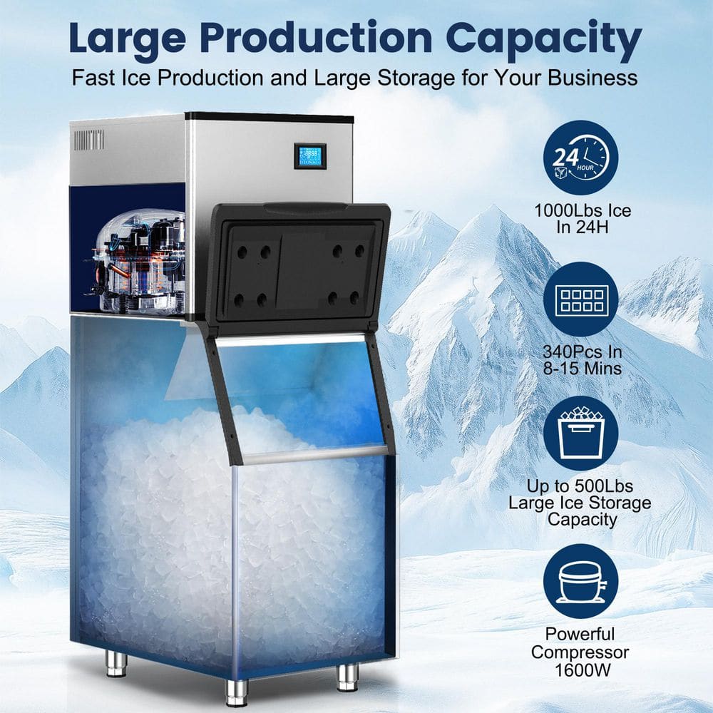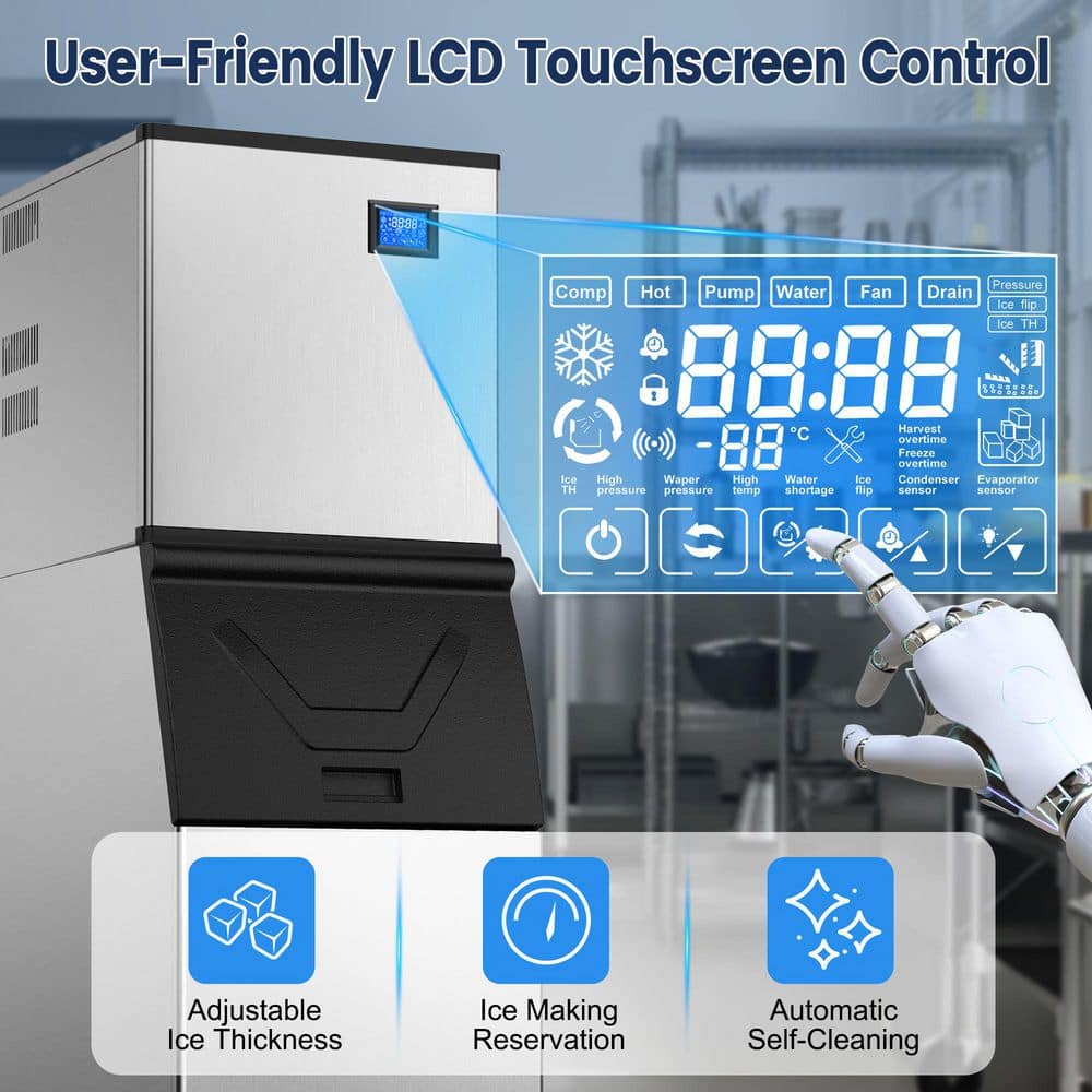 Our ice maker is ETL certified, making it perfect for commercial applications. With a state-of-the-art high-efficiency compressor, it produces 340 ice cubes in just 8-15 minutes and generates up to 1000 lbs. of ice in 24 hours. The 500 lbs. capacity ice bin ensures a steady supply, while the durable stainless steel construction, food-grade PP inner layer, and cyclopentane foam layer provide excellent insulation to delay ice melt. The user-friendly touch LCD control panel offers easy access to timer settings, ice and water shortage alerts, self-cleaning mode, and ice size adjustment. The independent split design with stable feet allows flexible placement in any environment, making it ideal for restaurants, hotels, stadiums, warehouses, or large households.