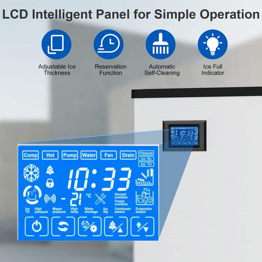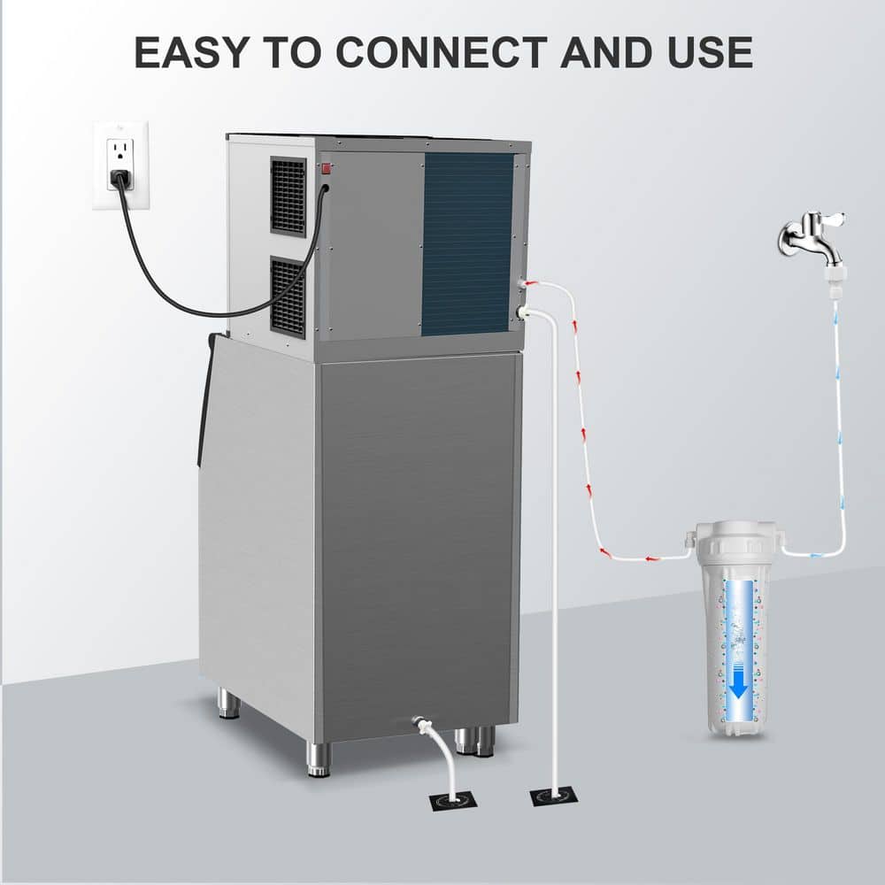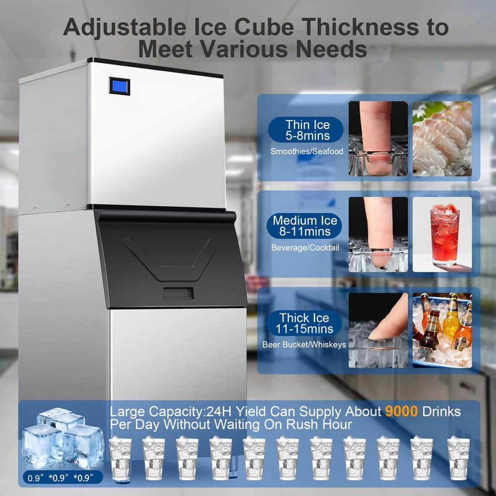 Upgrade your ice production with this 800 lb. Commercial Ice Maker, designed for high-demand environments like restaurants, hotels, bars, stadiums, and even large households. With a powerful 1800W compressor, this machine delivers up to 800 lbs. of crystal-clear ice every 24 hours, producing 340 cubes per cycle in just 8-15 minutes-keeping your business running smoothly even during rush hours. The included 500 lb. storage bin ensures you always have ice ready, while the food-grade PP liner and cyclopentane foam insulation maintain ice freshness and slow melting. Built with premium stainless steel, this unit is as durable as it is efficient, and its ETL certification makes it a trusted choice for commercial use. Enjoy easy operation with a user-friendly LCD touch panel featuring timer settings, full ice and water shortage alerts, adjustable ice thickness, and a 1-touch automatic self-cleaning mode. The customizable 1-24 hour cycle adds flexibility to match your business needs. Designed for convenience, the split-unit structure with four sturdy feet allows for flexible placement, and the automatic drainage system ensures low-maintenance upkeep. The package includes all essential accessories-filter, hoses, and ice scoop-so you can start producing ice right out of the box. Whether you're running a busy kitchen or hosting large events at home, this commercial-grade ice maker delivers powerful performance, reliable storage, and effortless operation.
