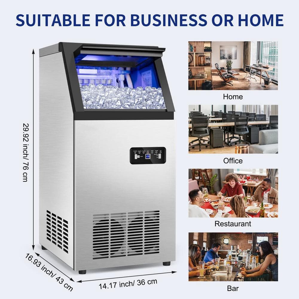 Get ready to elevate your ice-making game with our Commercial Ice Maker Machine. With its efficient powerful compressor, it can produce 45 clear ice cubes in just 12-20 minutes per cycle, delivering up to 120 lbs. of ice in 24 hours. That's approximately 350 drinks per day the large storage capacity of 35lbs ensures you'll never run out of ice during your cocktail parties or special events. Operating this ice maker is a breeze thanks to the intuitive LCD display panel. It offers various functions like self-cleaning, defrosting, reservation, and even reminders for malfunctions. You can easily adjust the ice-making time and ice thickness to suit your preferences. What sets our ice maker apart is its versatility. It supports two water inlet modes, allowing you to use tap water or gallon bottled water. Plus, the included premium water filter turns tap water into pure water, resulting in crystal-clear and harder ice cubes that are perfect for any occasion. Upgrade your ice-making experience with our Commercial Ice Maker Machine. Perfect for restaurants, bars, homes, and offices, it guarantees a constant supply of ice to meet all your needs. But remember, upon arrival, leave the unit upright for 24 hours before plugging it in. Get yours now and enjoy the convenience of having ice on demand.