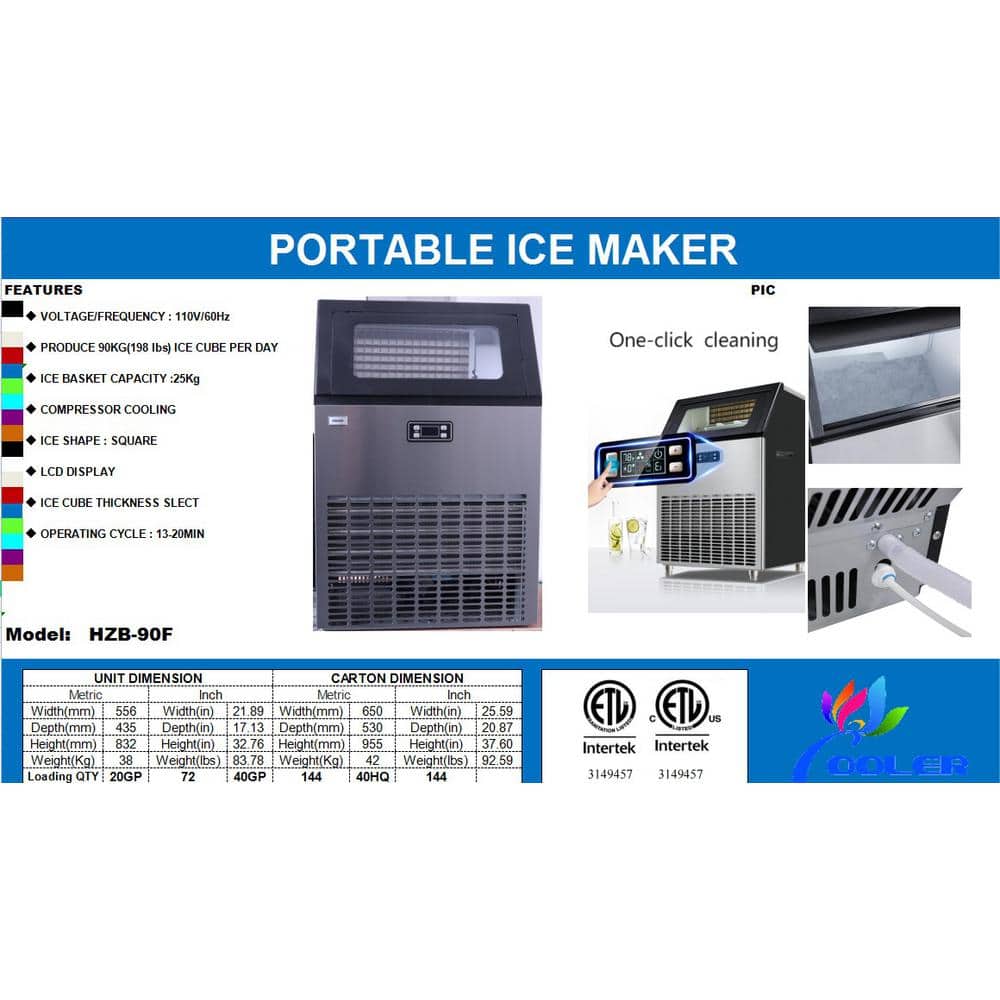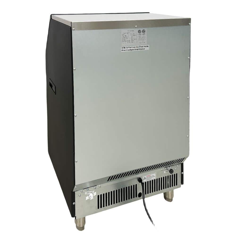 Cooler Depot Capable of producing up to 198 lbs. of full cube ice per day, these larger footprint under counters are great for meeting high production and capacity needs of busy restaurants, bars, or cafes. This machine also comes with an 55 lbs. bin to store a larger amount of ice once its made. There's also a clear window on the front to help you know when you're running low on ice or when you need to start removing excess ice for storage.