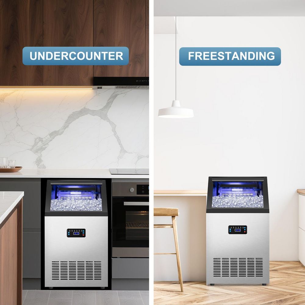 Designed for mid-sized restaurants, seafood counters, and catering services, this Ice Maker offers a perfect balance of performance and capacity. It can produce up to 120 lbs. of ice daily and store 45 lbs. in its insulated bin, keeping pace with peak-hour demands. It produces uniform, crystal-clear cubes ideal for beverage service and food presentation. The efficient cooling system ensures consistent output. Built with a durable stainless steel body and a low-noise compressor, it offers efficient and quiet operation, fitting seamlessly into busy work environments where reliability matters. Additionally, the gravity drainage system ensures hassle-free cleaning.