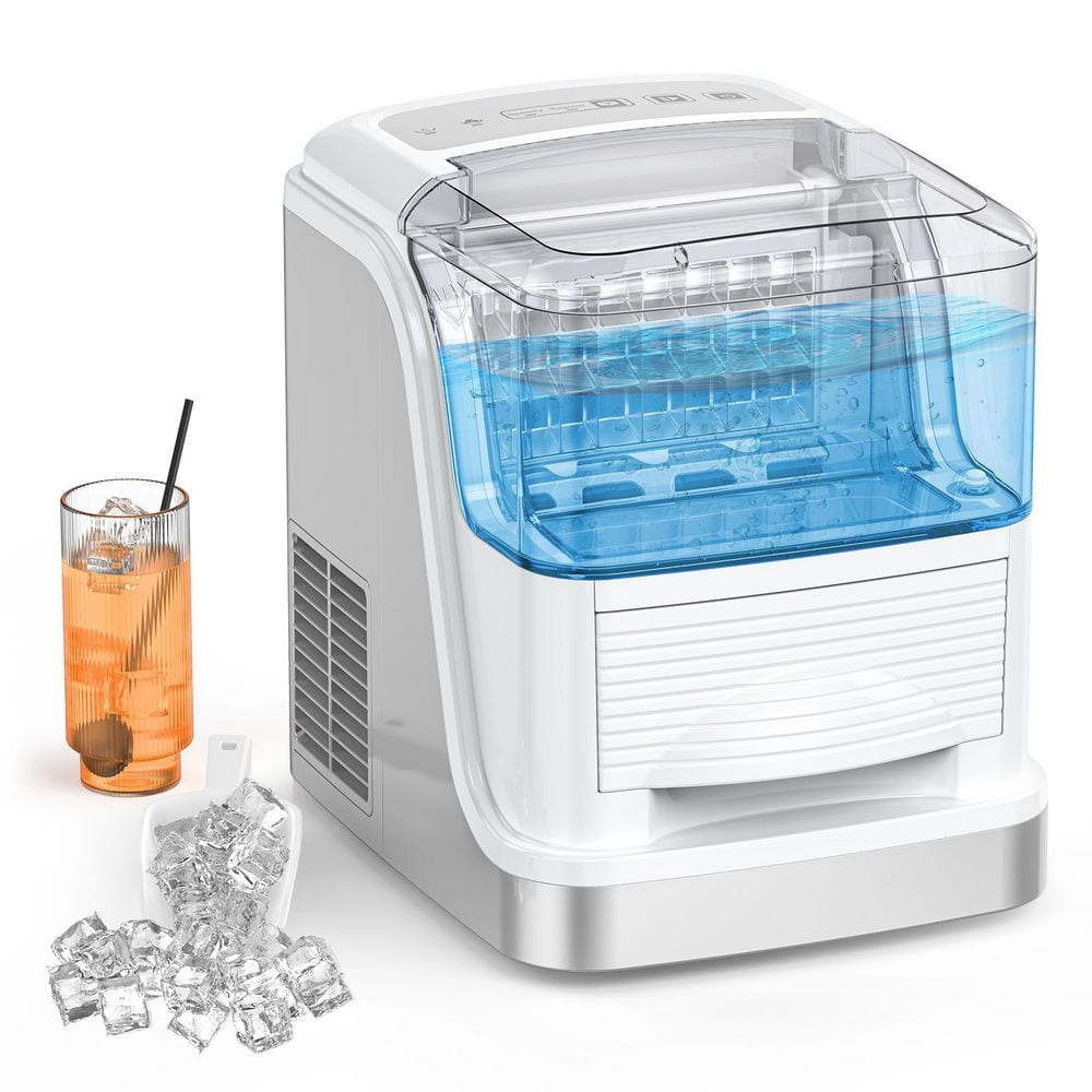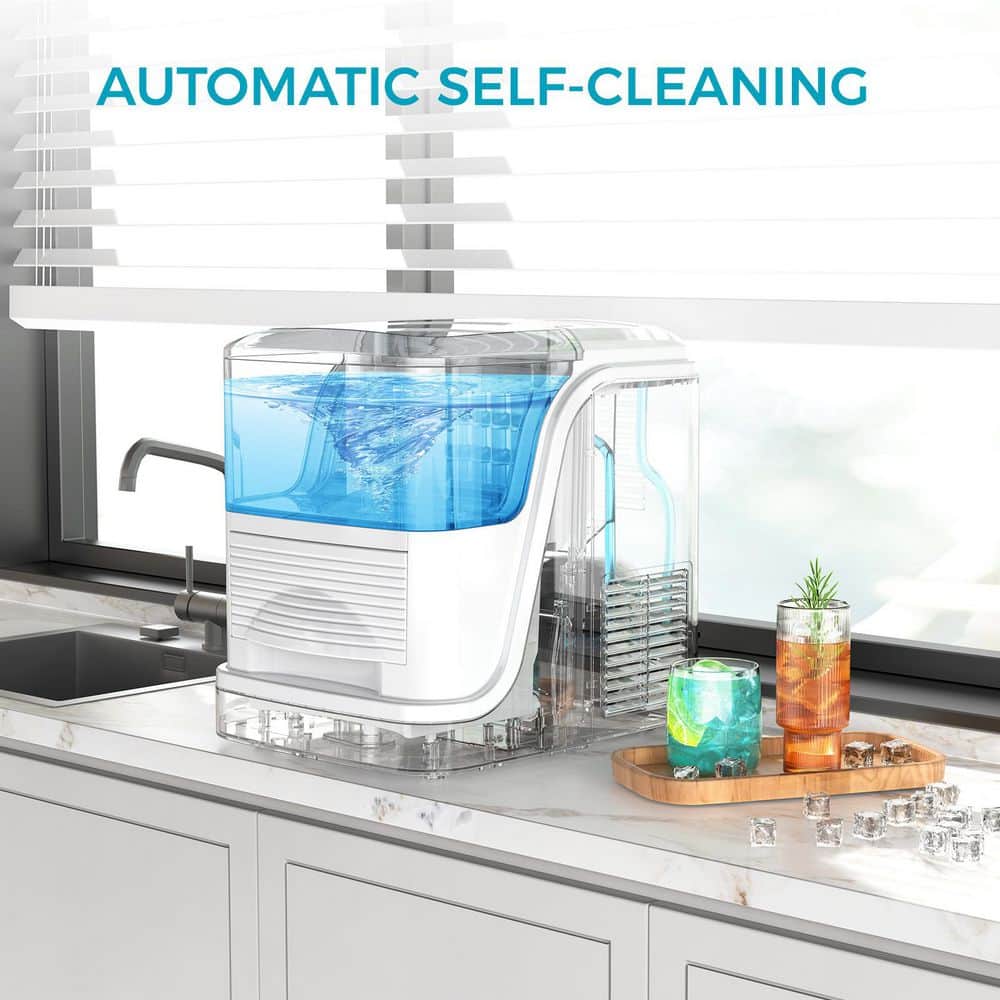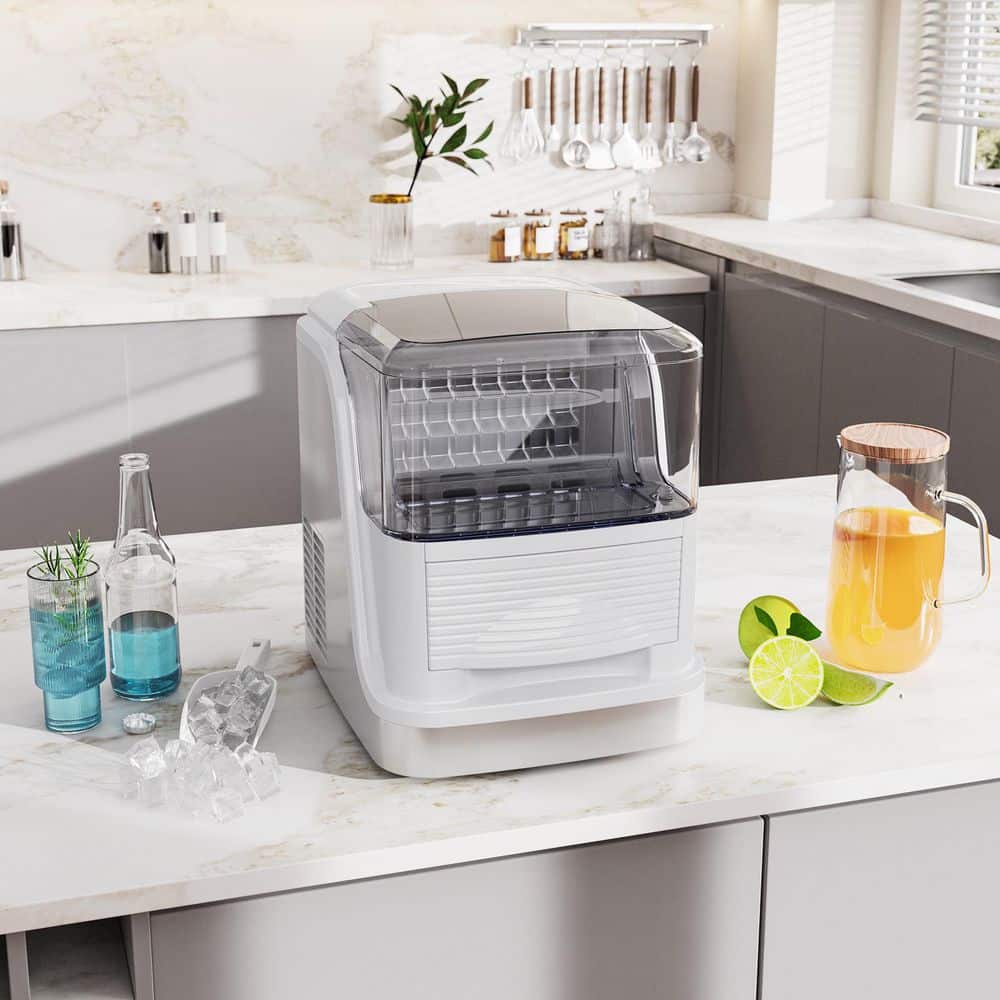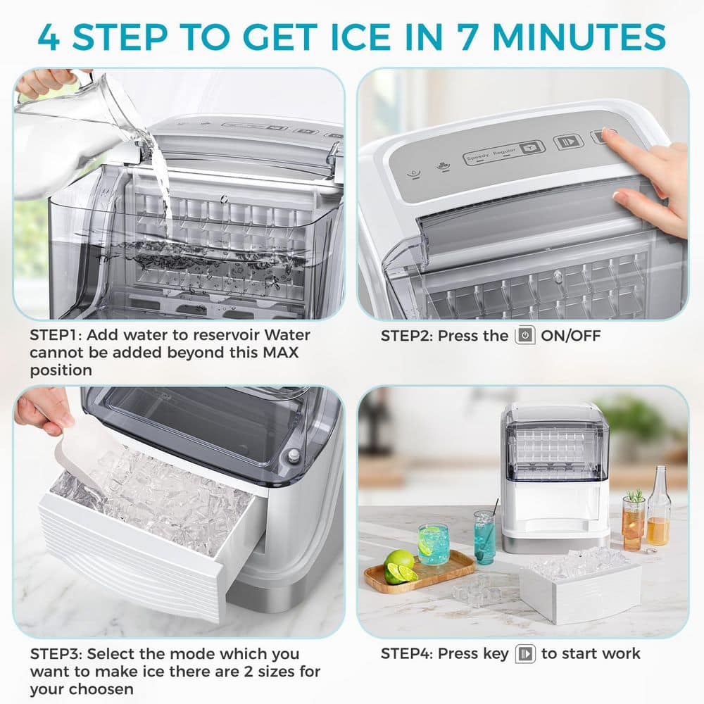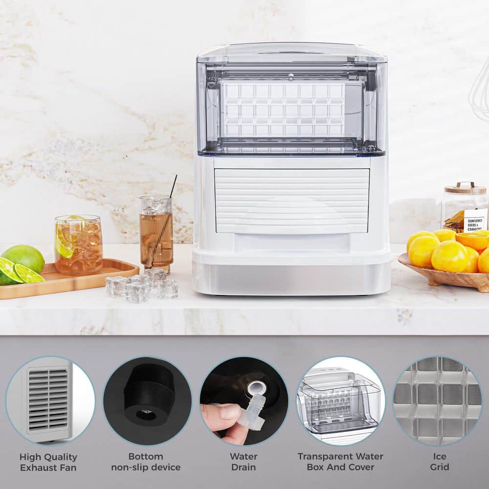 Efficient and Compact COWSAR Square Countertop Ice Maker for Your Home. Say goodbye to running out of ice. Our top-opening square ice maker is the perfect addition to your kitchen, bar, or small office. With a production capacity of 26 lbs. /24h, this compact machine delivers 8-large, crystal-clear ice cubes per batch in just 6-8 minutes, with each batch weighing over 70g. Perfect for keeping your drinks chilled and refreshing.