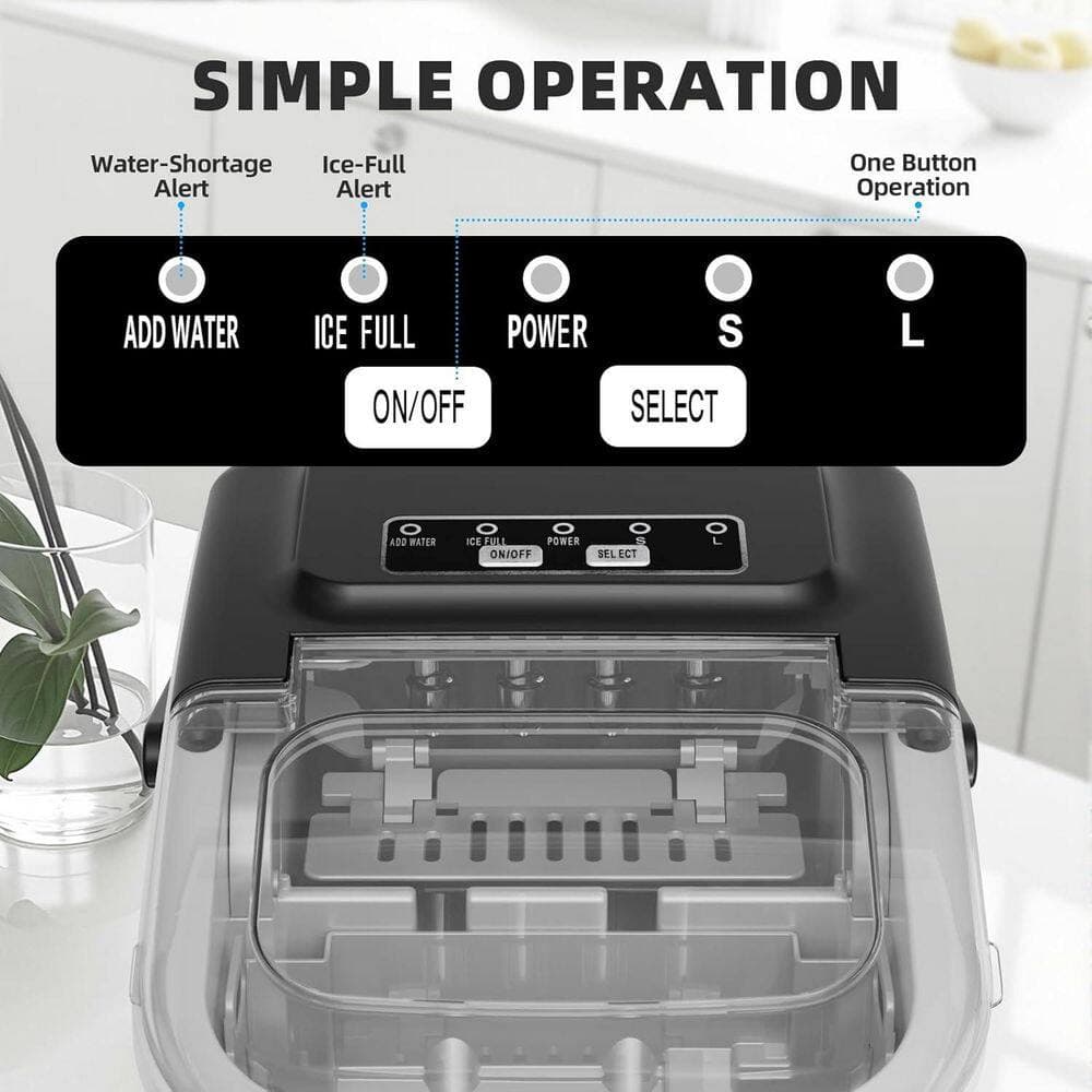 This compact bullet ice maker efficiently generates 8 fresh ice bullets every 6-12 minutes (26 lbs. /24hrs) with quiet operation. It featuring a one-touch self-cleaning function for hygienic ice, dual-size selection (S/L cubes) for cocktails or smoothies. There is an intuitive LED touch display with real-time water/ice alerts-all housed in a portable 12 in. design complete with a built-in handle, 2.4L water tank, visible water window, and overflow protection. Which making it perfect for dorms, offices, RVs, and outdoor events.