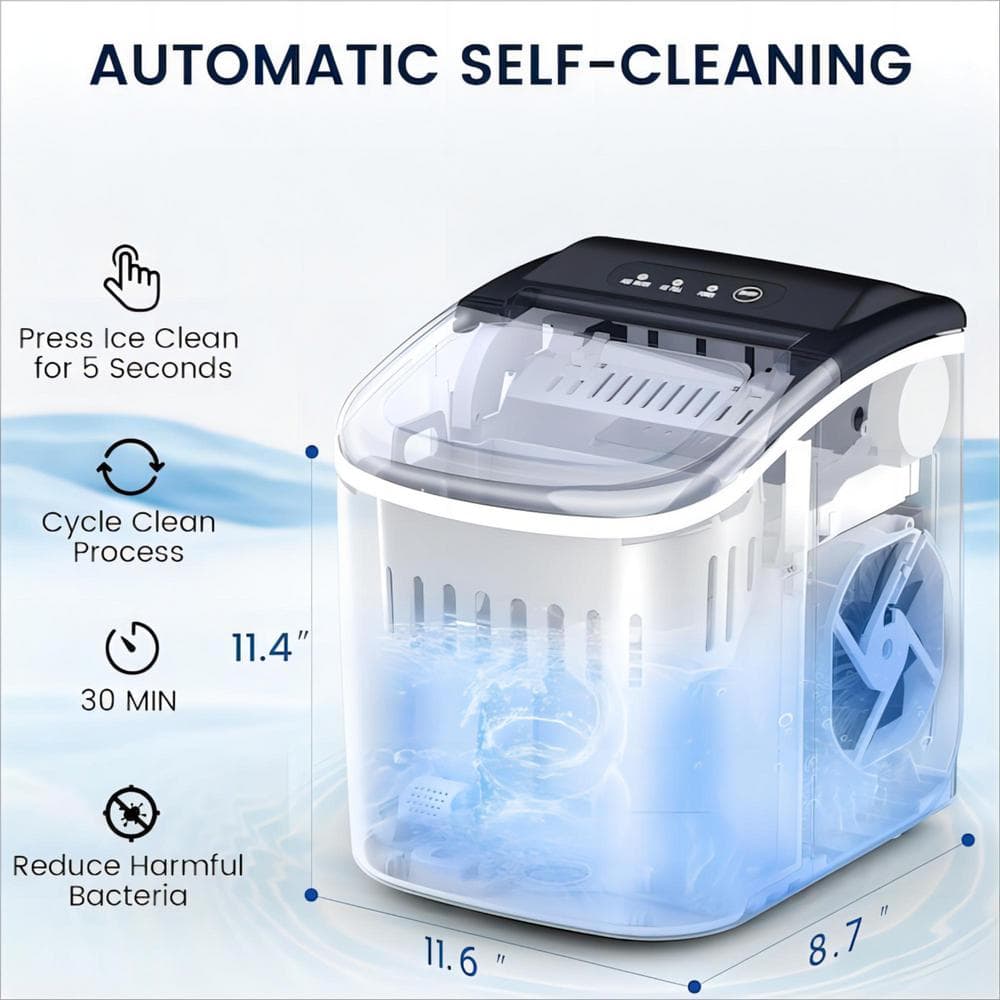 The portable countertop ice maker is the easiest and perfect way to bring ice into your home. Equipped with a high efficiency R600A compressor, this ice maker is capable of making ice quickly, with each round taking 8 minutes to make 9 pieces of bullet-shaped ice per cycle, making up to 26 lbs. of ice in a day. It is equipped with an auto-cleaning function, simply fill the water tank with water and then long press the ice making/cleaning button for 5 seconds to start the auto-cleaning. It will be the perfect addition to your kitchen. The large window allows you to keep the ice cool while checking on the production. Featuring with portable yet compact design, this premium ice maker machine is perfect for home, office, parties, and bars.