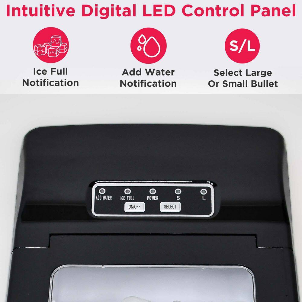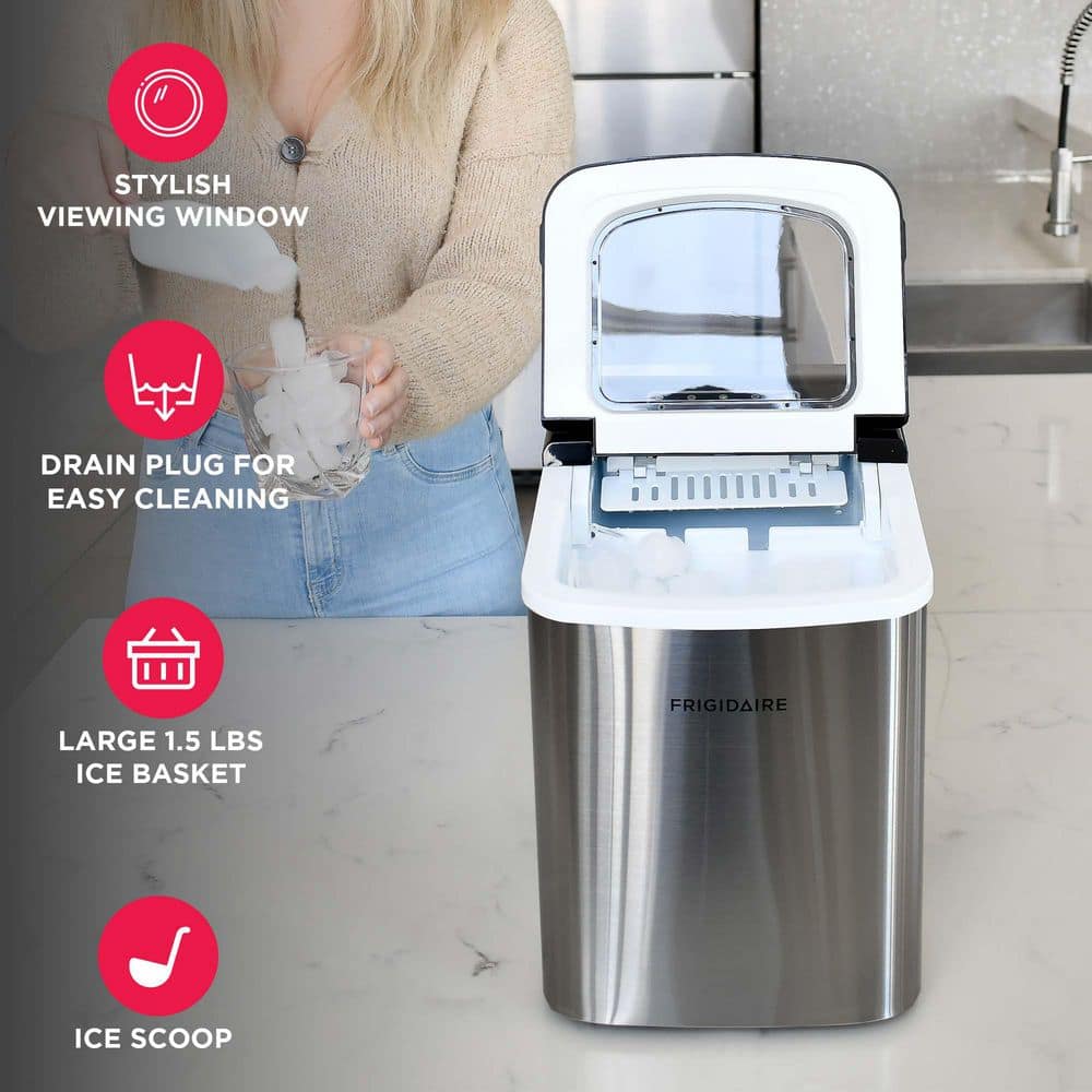 Always have enough ice cubes for a cold beverage with this incredible appliance. Whether you're entertaining guests during the holidays or need a way to cool down the kids, lemonade in those scorching summer months, the Frigidaire 26 lbs. ice maker will make every season that much easier. Boasting a 26 lbs. ice making capacity, it doesn't skimp on style with a stainless steel finish that makes it looks great with any decor. It features a sleek look and a compact space-saving design that is just the right size for your kitchen. It has LED-backlit controls that make them a breeze to read. The Frigidaire 26 lbs. countertop icemaker in stainless steel allows users to have fresh ice in less than seven minutes. Built-in air outlet keeps it cool and churning out ice without overheating. Simply fill the reservoir with water and select the desired cube size. It is also available in 2-stylish color options to blend easily with your kitchen's decor.