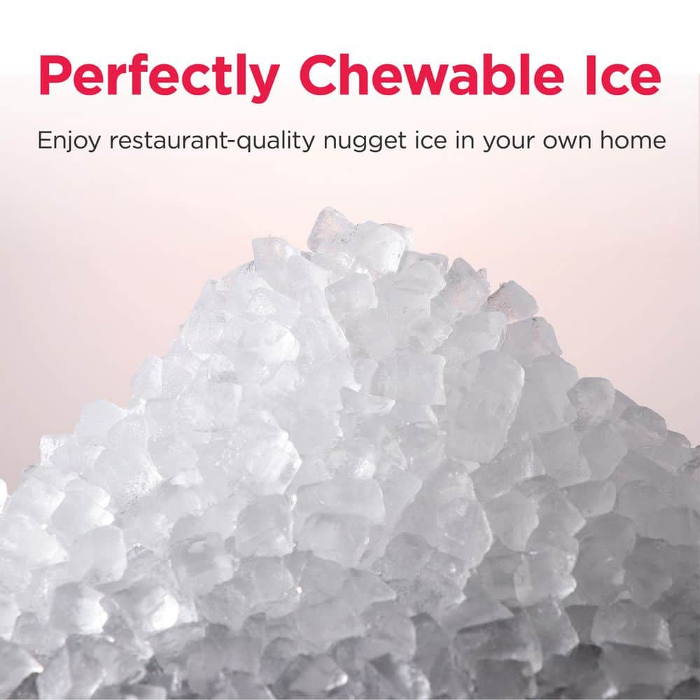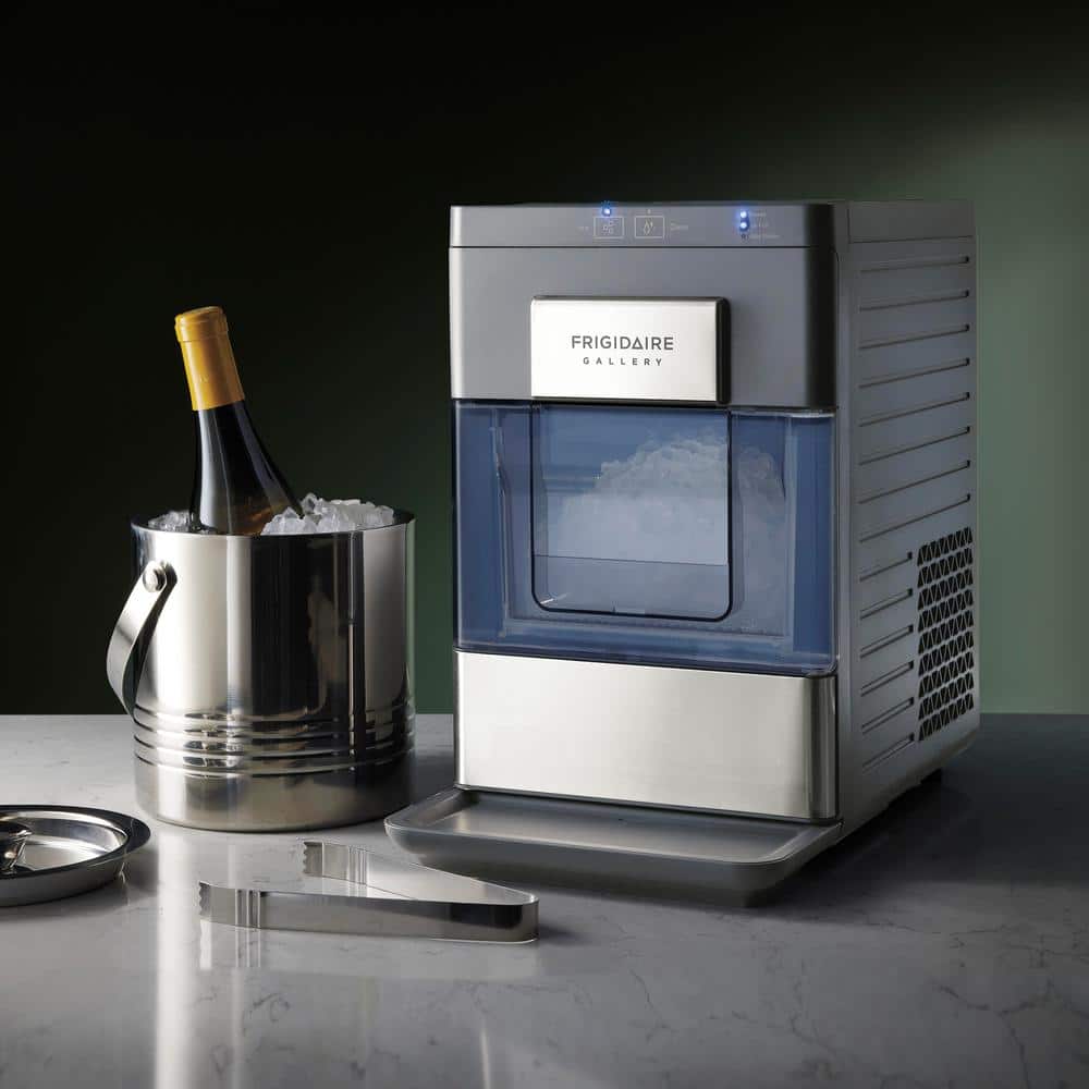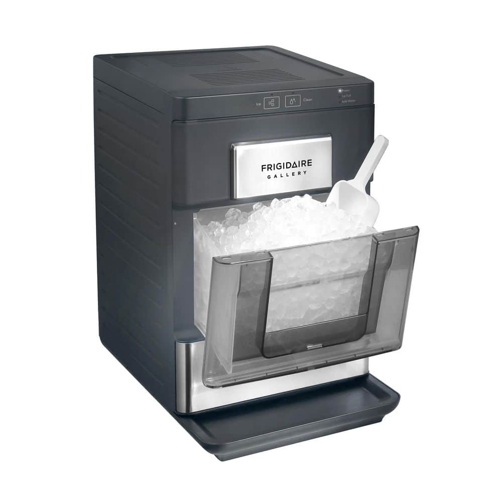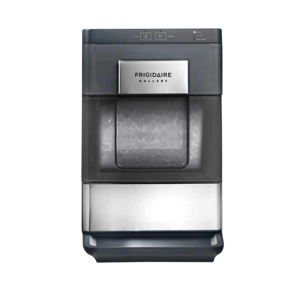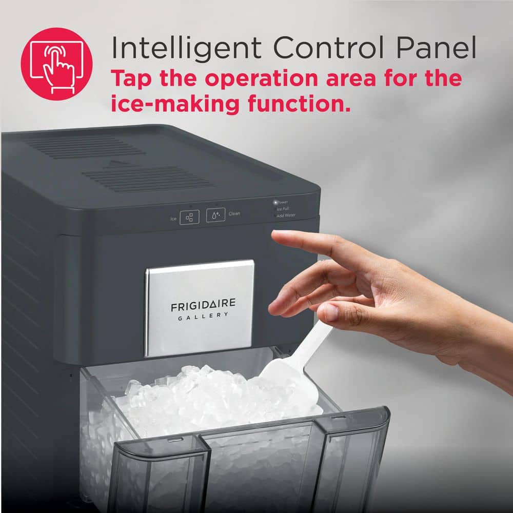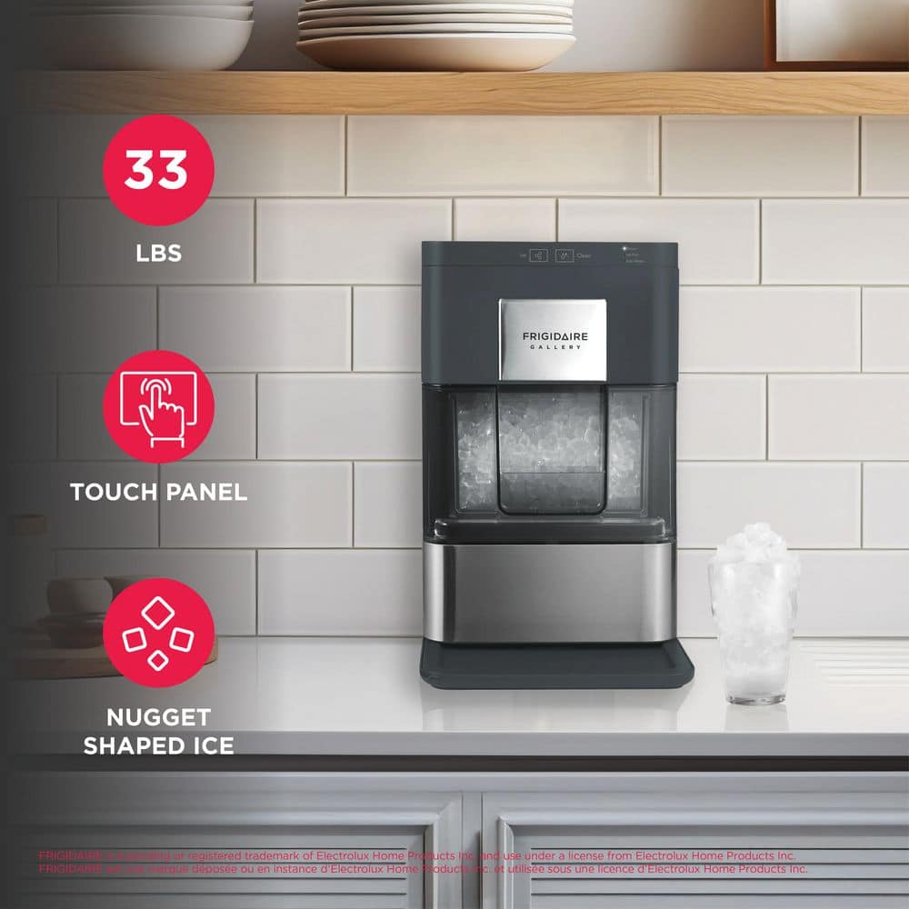 Introducing the Frigidaire Gallery Touch Control Nugget Ice Maker with a 33 lbs. capacity and stainless steel accent. Say goodbye to tough ice cubes and elevate your beverage experience with chewable nugget ice in the comfort of your own home. These unique soft yet crunchy nuggets float effortlessly in your favorite drinks, delivering a restaurant-quality experience. With its intelligent control panel, simply tap on the operation area to activate the ice-making function. Designed with convenience in mind, this ice maker features a drawer access and a viewing window, allowing everyone to catch a glimpse of the tantalizing ice that awaits. Its perfect size fits seamlessly on any countertop and can easily slide under kitchen cabinets. Plus, there's no need for a water hookup-simply plug the machine into any standard 115V grounded electrical outlet and fill the reservoir with water. Enjoy a generous capacity of up to 3 lbs. (2.5 quarts) in the ice basket, ensuring an ample supply of ice whenever you need it. The self-cleaning function guarantees fresh-tasting ice every time. With an operating temperature range of F-50 to 104, this ice maker adapts to your cooling needs. Its sleek matt finish adds a touch of elegance to any kitchen decor. For added convenience, an ice scoop and drip tray are included, making serving and cleanup a breeze. Elevate your beverage experience with the Frigidaire Gallery Touch Control Nugget Ice Maker and enjoy the perfect chewable ice anytime, anywhere.