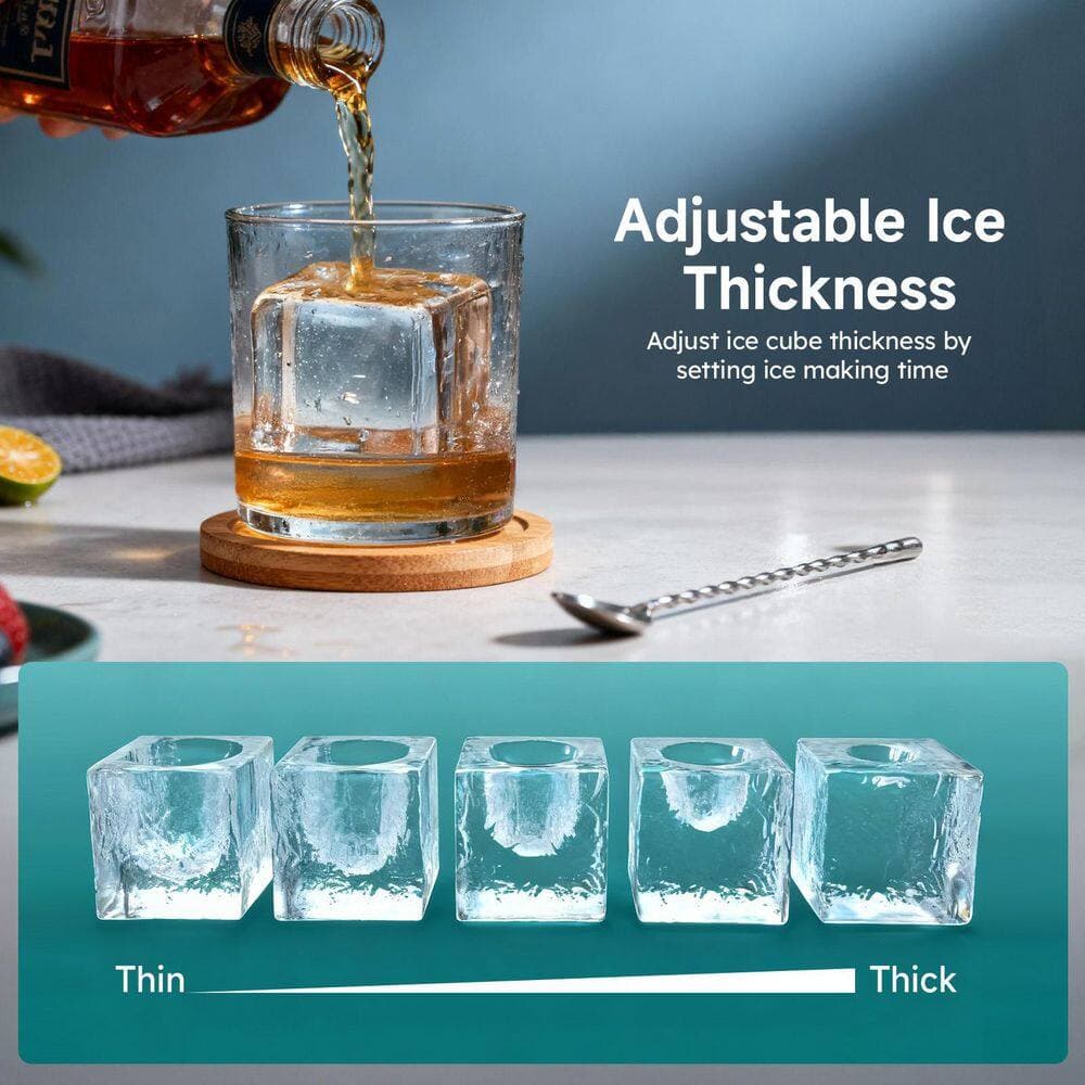 Designed for premium beverages, this countertop ice maker churns out 22 lbs/day of slow-melting large cubes (3 every 27 minutes)-say goodbye to watered-down whiskey, cocktails, and iced drinks! Enjoy pure, clean ice with the one-touch self-cleaning function, which eliminates scale and residue without scrubbing. Its whisper-quiet operation (under 40dB) and 24-hour timer ensure no disturbance, whether at home or work, while the removable 2L water tank and 4.4 lbs ice basket minimize refills and maximize convenience. Built with stainless steel and high-efficiency cooling, it's durable enough for kitchens, bars, offices, or RVs-complete with an ice scoop for pro-level serving. Perfect for entertaining or daily use, it's your gateway to undiluted, professional-quality drinks every time!