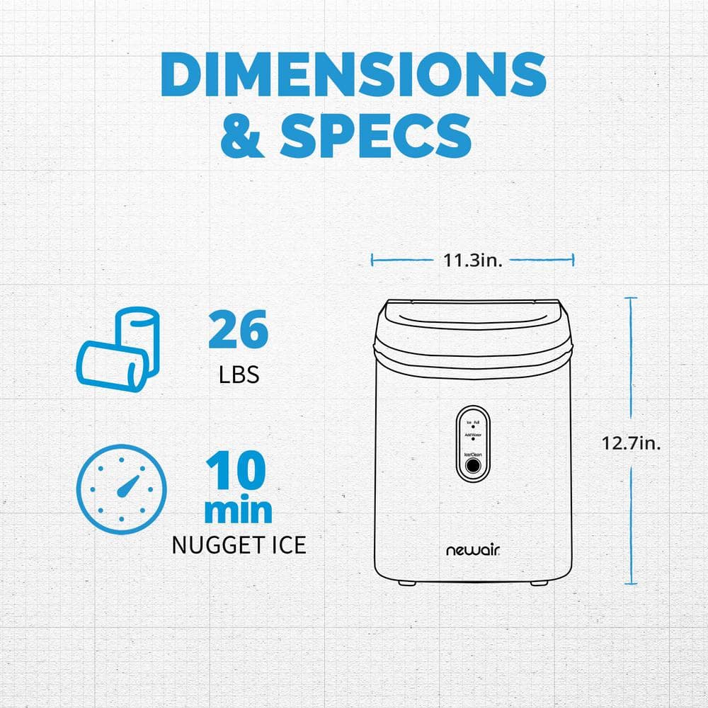 The NewAir 26 lbs. Countertop Nugget Ice Maker brings your beverages to their refreshing best while maintaining a small countertop footprint. This portable model is lightweight enough for travel, making it ideal for a trip to the lake house or on a road trip in the RV. The Newair chewy ice maker makes a non-stop supply of the good ice that you crave: clean, pure, and perfectly shaped for crunching on when your drink is gone. The small design takes up very little counter space while still providing 26 lbs. of fresh, clean-tasting ice each day and the exclusive Matte Black finish will enhance any kitchen decor.