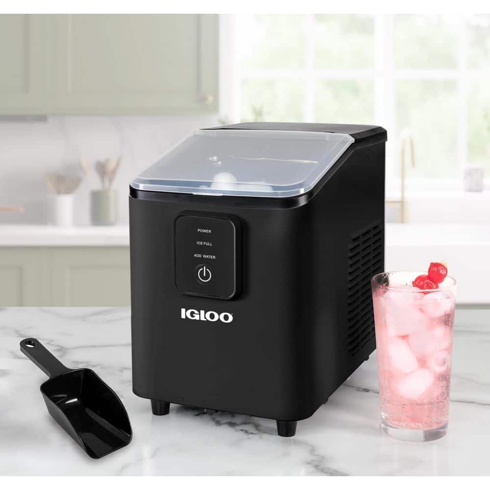 Meet the Igloo Self-Cleaning Countertop Ice Maker, your stylish and portable solution for keeping beverages perfectly chilled. In 7 minutes, you'll have your first batch of ice ready, and in a full day you can make up to 26 lbs. of ice. With a design that's sleek yet compact, you will save a ton of extra counterspace while still producing plenty of ice for keeping drinks cool. Operation is simple with a single-button control panel with LED indicator lights that signal when ice is full or water is needed. The included 1-pound ice basket and ice scoop ensures easy ice serving. The automatic 5-cycle self-cleaning function makes clean up easy and allows clean ice to be made every time. Perfect for pool parties, home bars, dorm rooms, offices and more. Cold Drinks. Warm Smiles.
