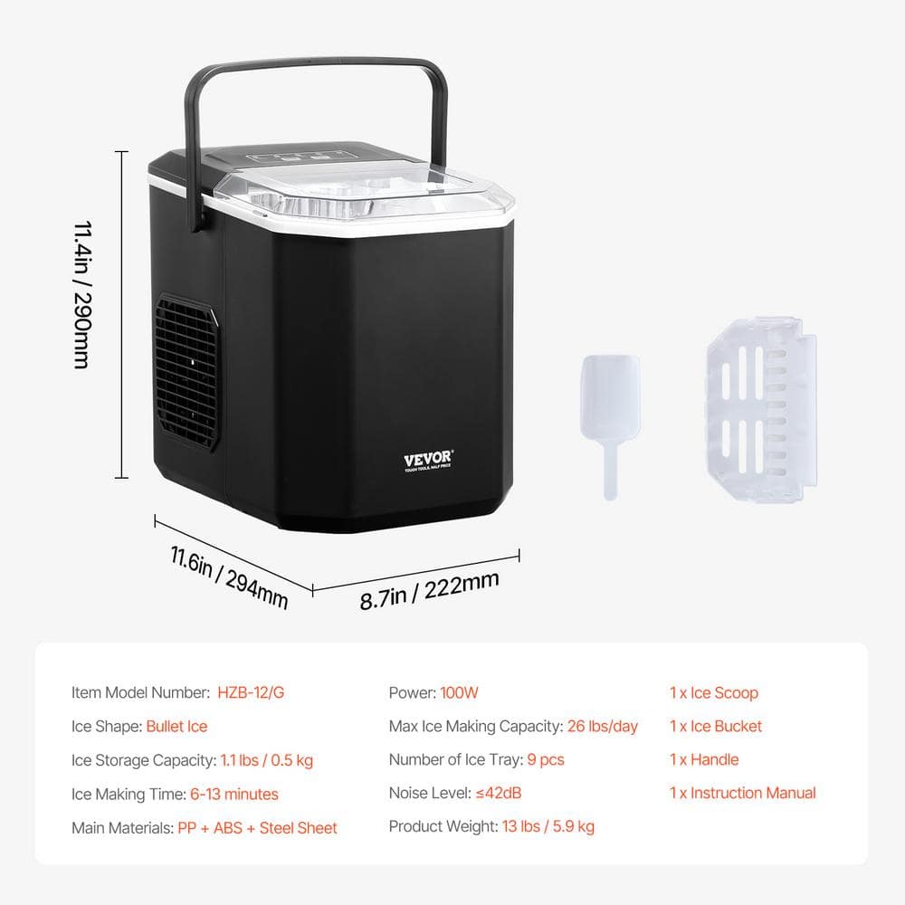 VEVOR Countertop Ice Maker Bullet 26 lbs. in 24-Hrs Self-Cleaning 11.6 in. Width Portable Ice Maker Black