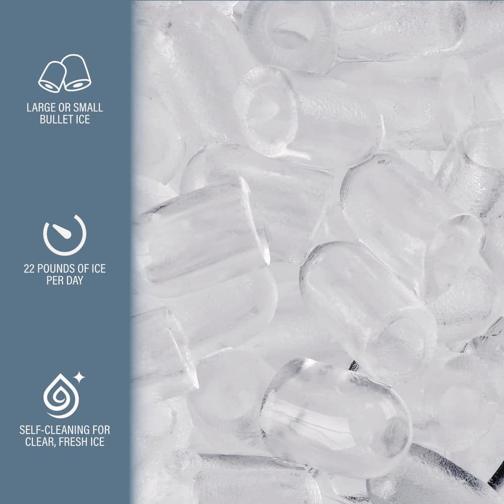 - Makes 70 pieces of bullet ice per hour and 22 lbs. per day