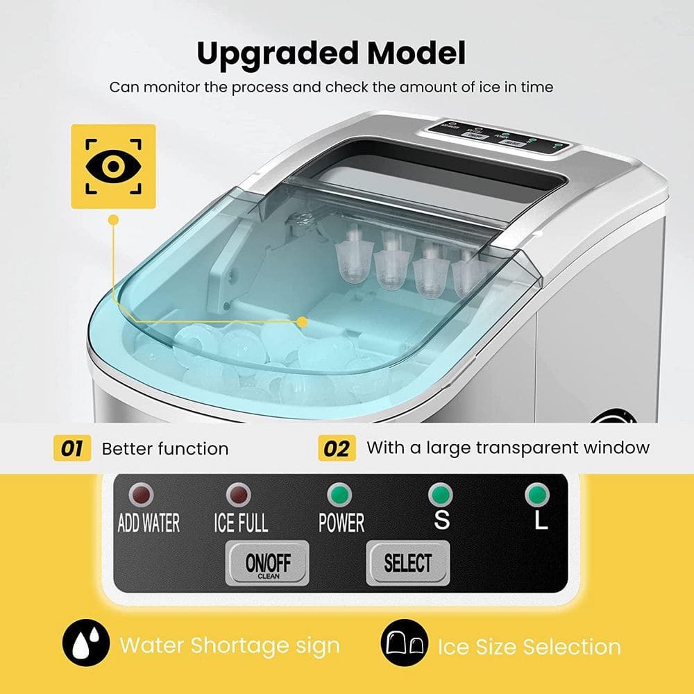 The upgraded VIVOHOME portable ice cube maker provides you with an upgraded user experience with better functions. The machine comes with a mega transparent window for you to monitor the ice-making process clearly. As compact as it is, the ice cube maker can make up to 27 lbs. of ice cubes per day in 24 hours. The package also comes with 10 pcs of ice bags for more convenience.