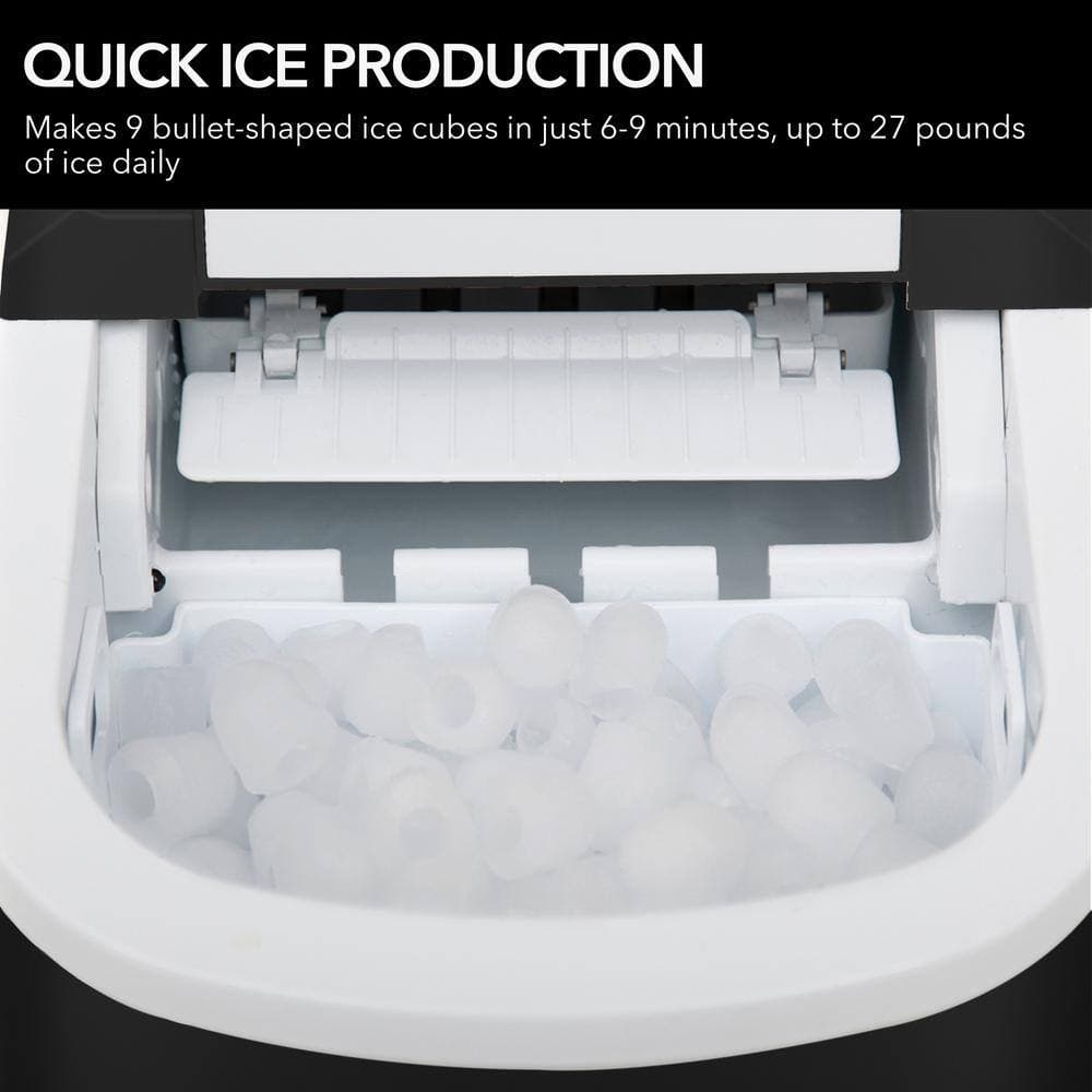 - Portable ice maker produces up to 27 lbs. per day