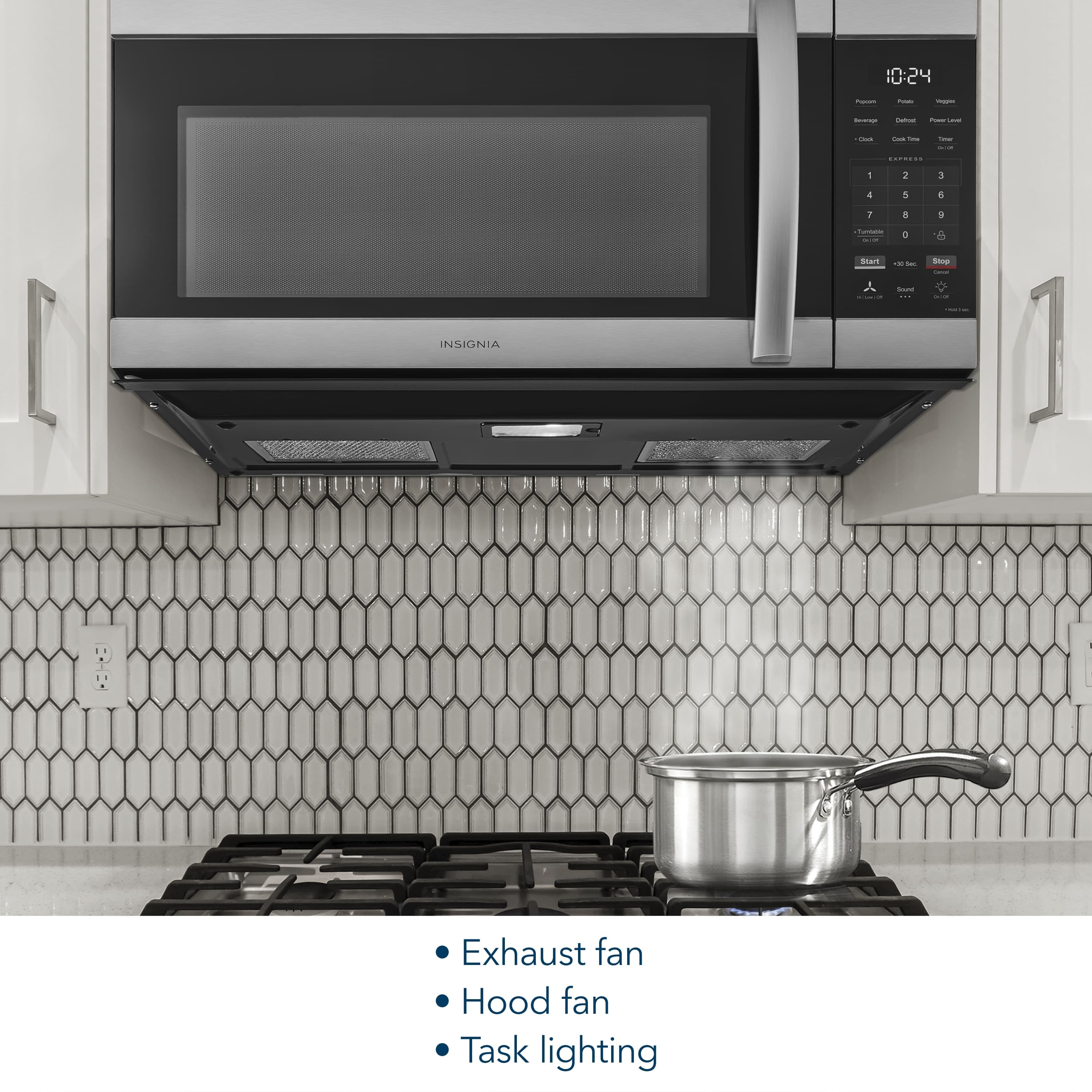 Not only does this microwave use a powerful 1,000 watts, it also features 11 power levels and a two-stage cooking function—programming two cook times and power levels at the same time—so you can control exactly how you cook. A removable turntable helps evenly heat the food and can be turned off if needed. When your stovetop dishes produce too much steam, simply turn on the fan to vent or filter to clear the air. Exterior task lighting makes it even easier to keep an eye on dinner. Solve dinnertime frustrations with the Insignia 1.7 Cu. Ft. Over-the-Range Microwave with 2-Stage Cooking.
