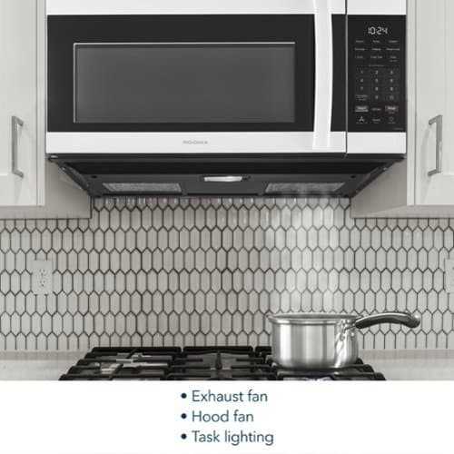 Not only does this microwave use a powerful 1,000 watts, it also features 11 power levels and a two-stage cooking function—programming two cook times and power levels at the same time—so you can control exactly how you cook. A removable turntable helps evenly heat the food and can be turned off if needed. When your stovetop dishes produce too much steam, simply turn on the fan to vent or filter to clear the air. Exterior task lighting makes it even easier to keep an eye on dinner. Solve dinnertime frustrations with the Insignia 1.7 Cu. Ft. Over-the-Range Microwave with 2-Stage Cooking.