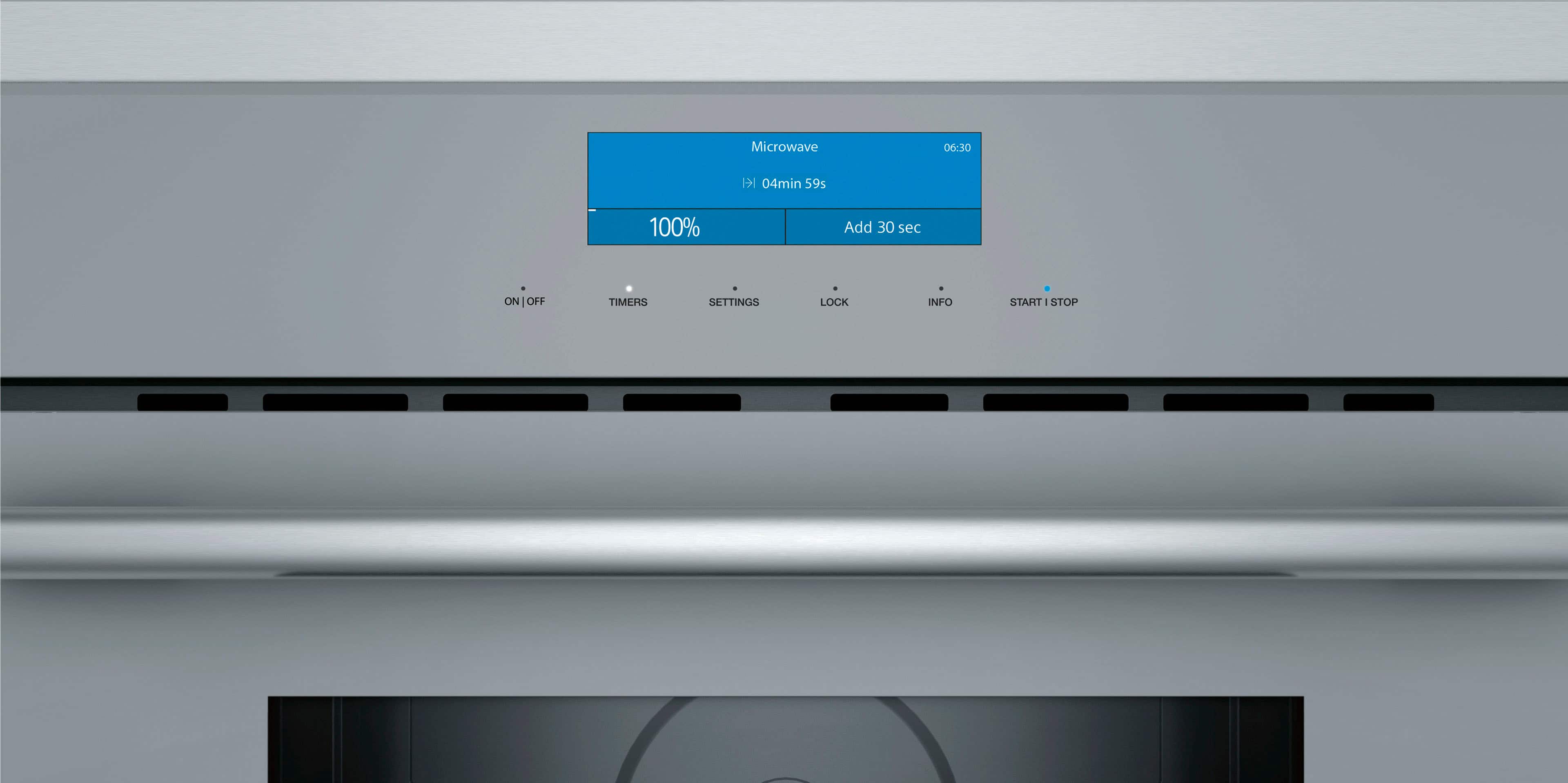 Thermador Drop-Down Door Microwaves offer 10 cooking modes, auto defrost, and sensor cooking which measures humidity to achieve perfect results. Spacious 1.6 cu. ft. interior. 30-inch width can be installed in horizontal and vertical configuration. Standard or flush installation into kitchen cabinets. Child safety lock.