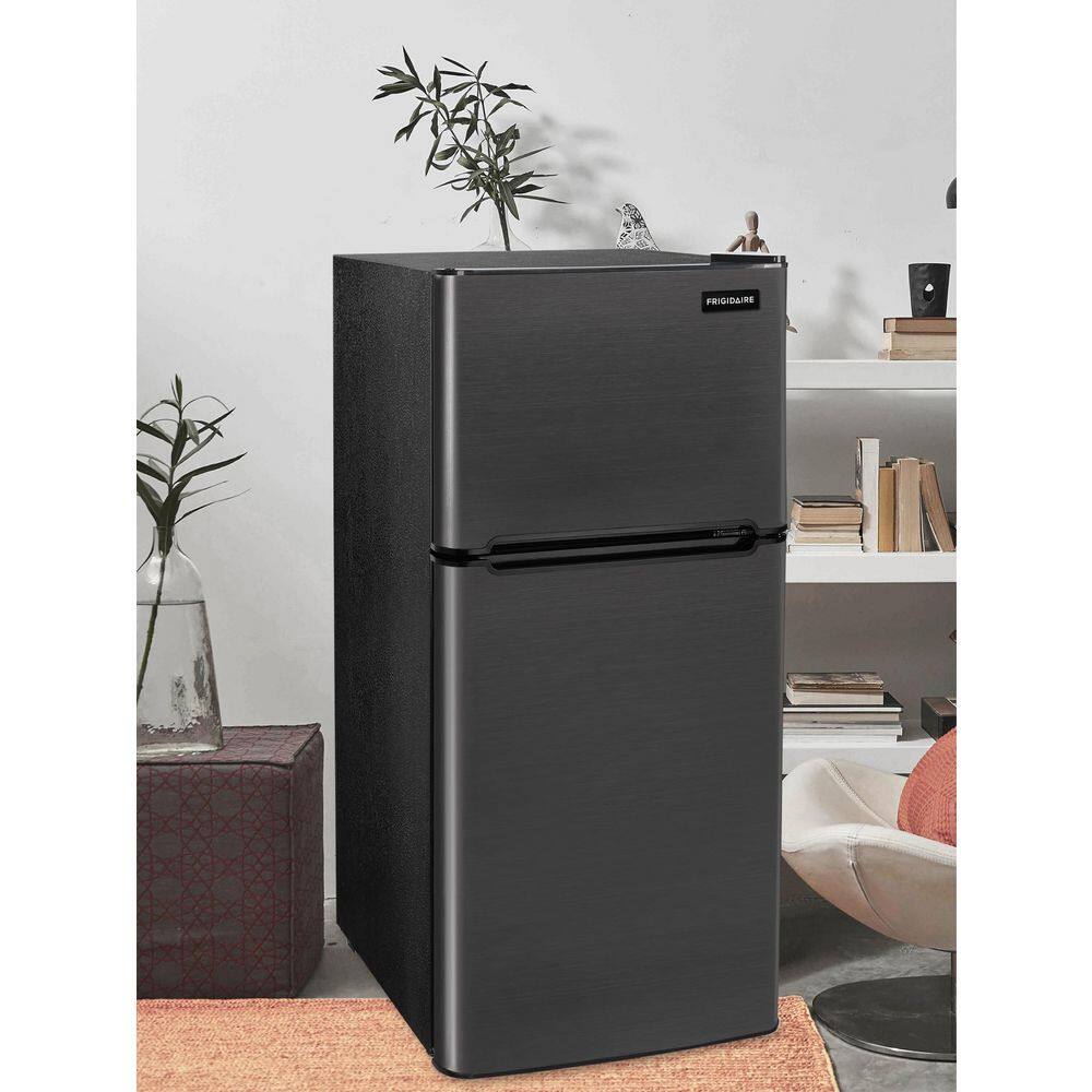 4.5 cu. ft. 2 Door Mini Refrigerator in Black Stainless Steel is the ideal size for your She Shed, Man Cave, Home or Office. It has ample space for all your favorite beverages and snacks. The Dispense-A-Can and 2 Liter Door Bins keep your beverages organized, and the Removable Shelves make keeping your fridge clean and fresh a breeze.