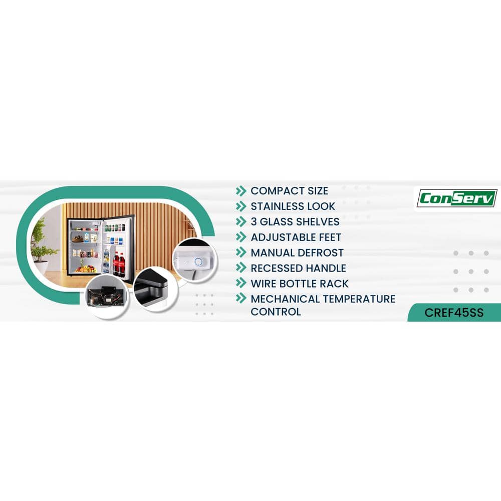 The Conserv CREF45SS Compact Refrigerator is the mini fridge you need when you're limited on space but have big needs. A sleek, stainless-steel look that matches any space, this powerful little fridge will keep your food fresh, drinks chilled, and snacks organized. The 4.5 cu.ft. fridge, measuring 31.5x 20.3 x 21.3 inches (HxWxD) comes with the comfort and conveniences you need, such as a reversible door, moveable glass shelves, adjustable feet, a wire bottle rack, and a recessed handle. Built with a mechanical temperature control and manual defrost, this unit is one of the most eco-friendly solutions available for your office, dorm room, basement, or RV.