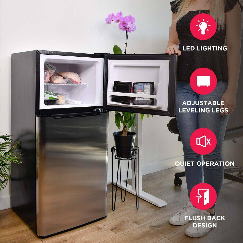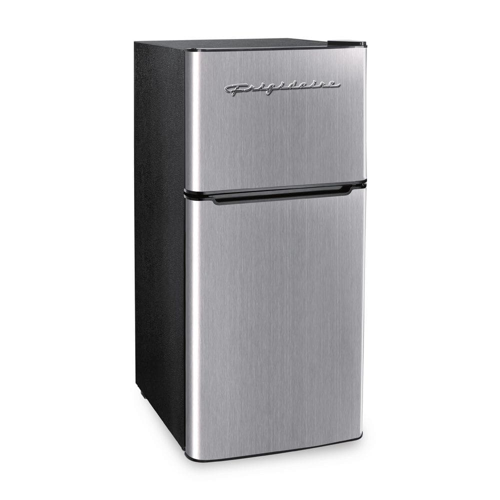 This Retro Platinum Frigidaire 4.5 cu. ft. Compact Refrigerator with chrome trim has space for your groceries but small and compact to fit in small places. This model features a top-mount full size freezer and storage door. Slide-out shelves provides efficient storage options and adds to its unique style. Designed for energy efficiency, The flush-back design and door handle with retro appearance that looks great in your home, in a dorm or at the office.