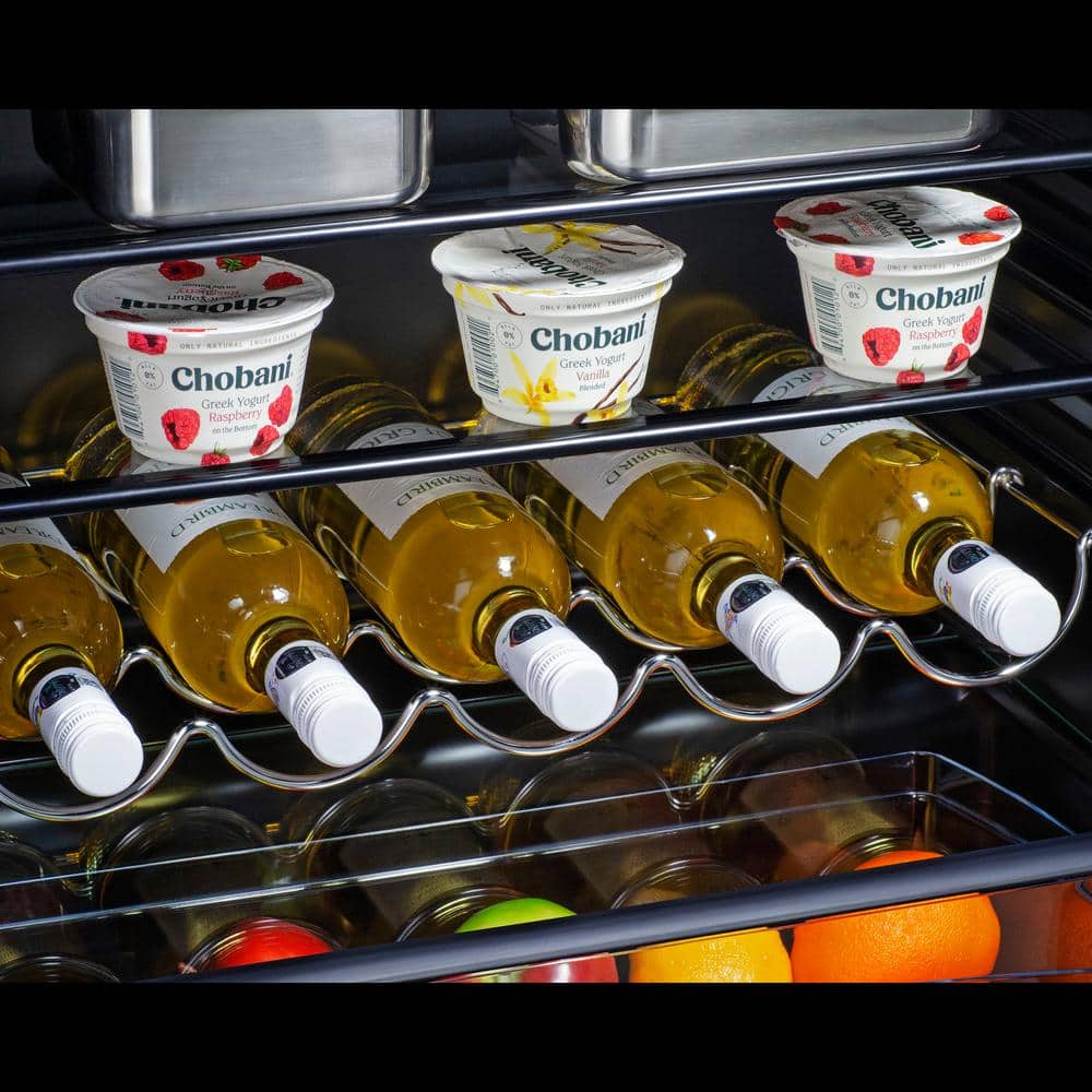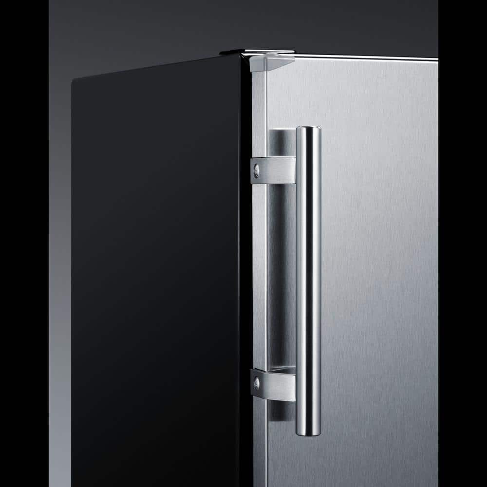 Update your kitchen with this 24 in. W 5.5 cu. ft. freezerless refrigerator. Made for residential use, this Energy-Star certified unit can be set up freestanding or as a recessed installation. A special coating on the user-reversible stainless-steel door makes it fingerprint resistant, and the jet-black exterior cabinet adds a sophisticated feel. An interior light helps you see when the door is open. The dial thermostat enables easy operation without any internal boards or chips. It runs quietly at less than 33 dBA. With adjustable legs, you can set the height between 33-1/2 in. and 34-1/2 in. A black steel leg shield is provided for optional use if you find there is too much space between the front and floor when the unit is set at its taller height. The 5.5 cu. ft. interior gives it a higher storage capacity than other counter height units in the market. A black interior liner and black trimmed adjustable glass shelves allow spill-proof storage. For more storage options, it comes with a removable scalloped steel rack for holding bottles horizontally. A clear crisper and three clear door racks add more easy access to produce and condiments.