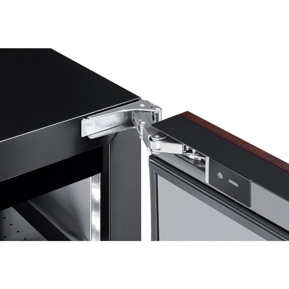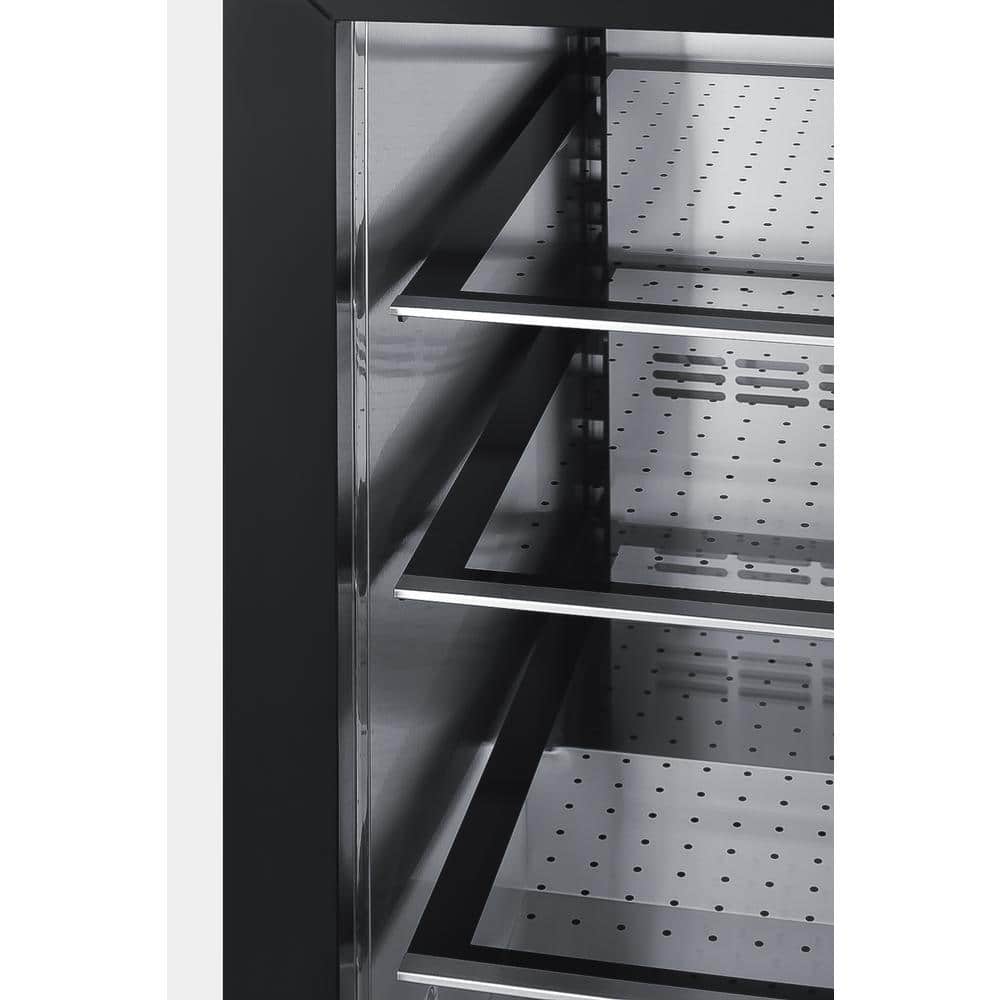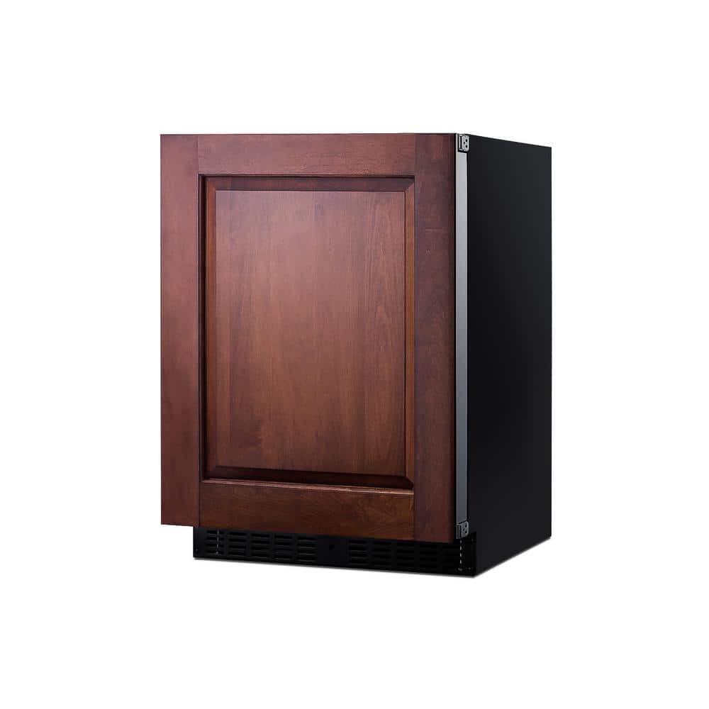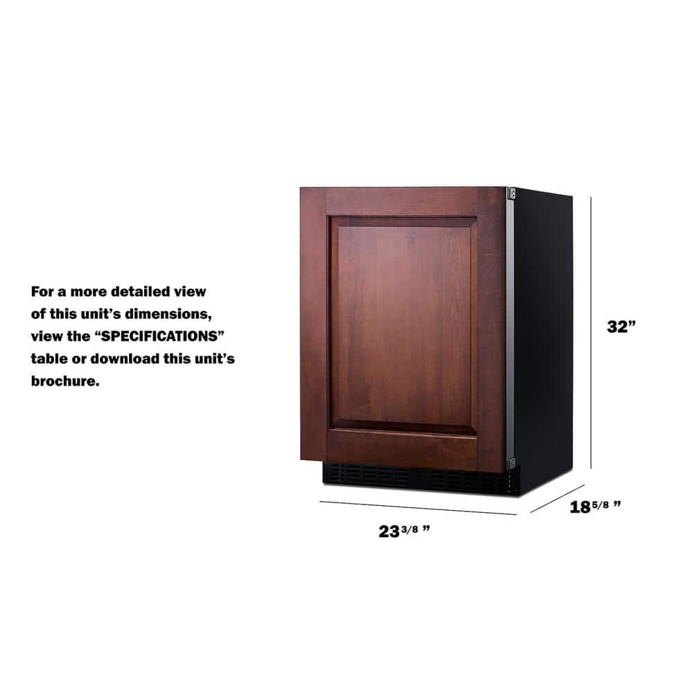 24 in. wide all-refrigerator sized under 18 in. deep. It comes in a 32 in. height to fit under lower ADA compliant counters, with adjustable legs and a sliding kickplate cover that also allows you to raise the overall height up to 34 in. to fit standard counter spaces. The front-breathing system allows built-in installation, while the fully finished black cabinet also allows freestanding use. This unit has a sealed rear and right-angle cord for a better fit. The door is designed to accept full panel overlays, allowing users to seamlessly blend the unit into their own cabinetry design panel size: 28.38" H x 23.4" W; maximum weight: 10 lbs. Customers provide their own handle to complete the look. Inside, the ASDS2413IF features stainless steel construction for improved durability and sanitation. Fan-forced cooling ensures even temperature distribution and fast temperature recovery. Recessed LED lighting offers an attractive yet efficient look. The digital thermostat makes it easy to manage the interior temperature. This unit includes cantilevered shelving in glass for flexible storage. Additional features include an open-door alarm, high temperature alarm, and Sabbath mode setting that lets you disable some of the electrical elements during periods of observance.
