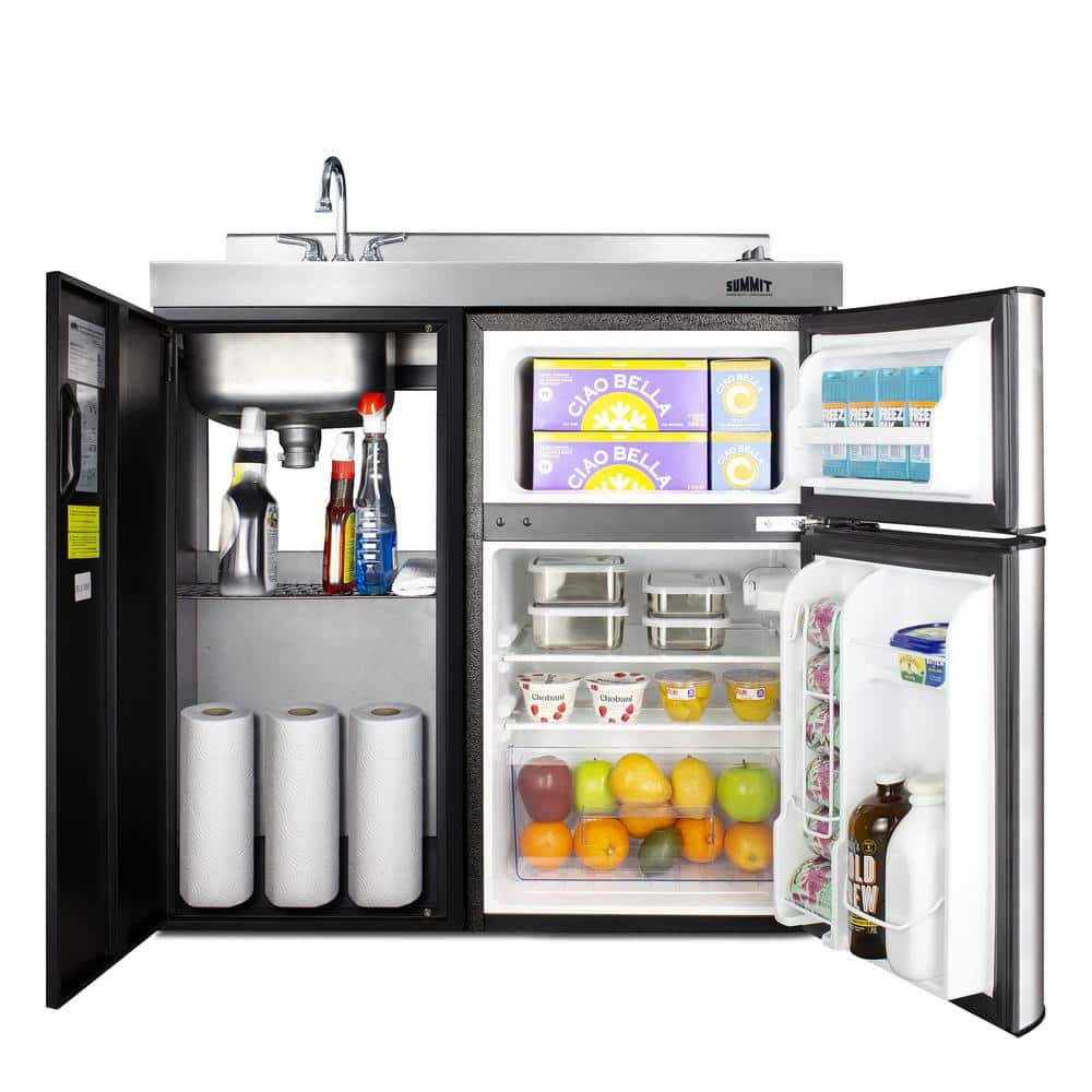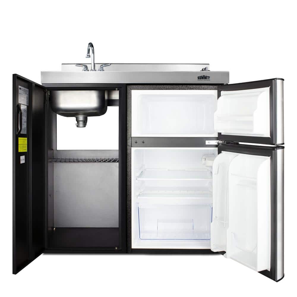 36 in. W kitchenette with an easy-fitting 24 in. D Its black exterior brings a modern look to efficiency spaces, with added touches of stainless steel on the kitchenette work surface and refrigerator doors. This unit includes a built-in 115-Volt radiant cooktop with a rear 500-Watt and front 900-Watt coil element to accommodate a range of heating options. The power cord comes pre-installed for easy setup. The left side of the kitchenette features a compact sink with ready-to-use faucet. A cabinet with a removable shelf is located below the sink for dry storage. Unlike many other brands' kitchenettes, all Summit units include a refrigerator with a freezer compartment to cover all of your cold storage needs. includes the two-door, ENERGY STAR certified with 3.2 cu.ft. of storage space. A dual evaporator system separately cools the auto defrost refrigerator section and manual defrost freezer compartment for improved overall performance. This model also includes an adjustable glass shelf, door storage and a crisper. The CK36ELE is packaged and shipped in one box. Perfect for studio apartments, hotel rooms, dormitories, assisted living facilities, temporary kitchen facilities and any other location in need of a low maintenance, fully-featured compact kitchenette. Additional choices are available with smooth-top cooktops, and in 30 in., 39 in., 48 in., and 60 in. W sizes. Browse our website for more.