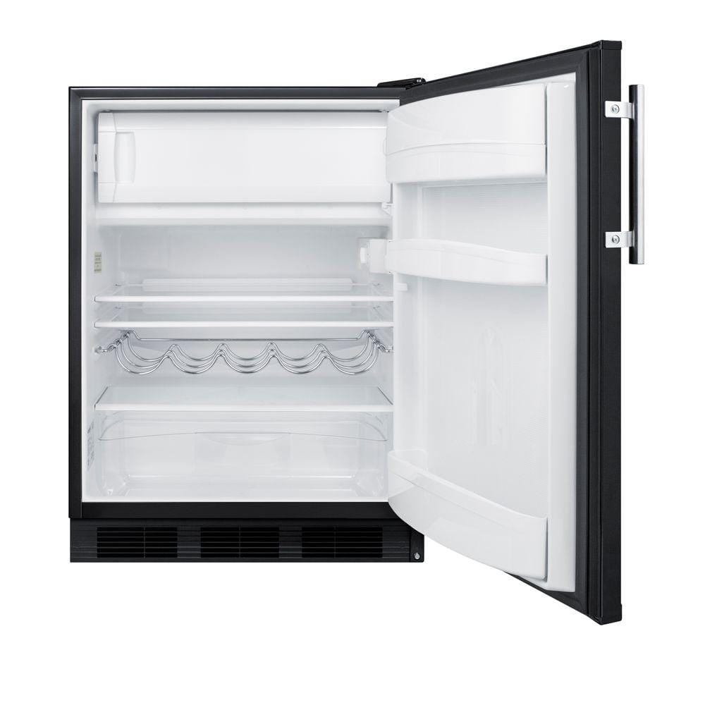 Summit brings quality and value to counter height refrigeration with a versatile selection of residential refrigerator-freezers. The CT663BK is a residential refrigerator-freezer made in Europe and designed for freestanding use in home kitchens. Sized with a 24 in. footprint, itoffers a generous 5.1 cu. ft. storage capacity, a larger interior than many units in this size class. This model features a black exterior finish with a user-reversible door swing. A stainless steel handle completes the look. Inside, the CT663BK features a dual evaporator to allow separated cooling of the fresh and frozen food sections. The refrigerated compartment utilizes low maintenance automatic defrost, while the interior freezer compartment is manual defrost to achieve lower storage temperatures ideal for ice cream and other frozen food. The deluxe interior includes adjustable glass shelves for spill-proof storage and easier cleaning, as well as a scalloped wine shelf to hold wine and champagne bottles safely in place. Door racks offer additional convenience for tall bottles and condiments and a clear crisper drawer ensures your produce is stored under the ideal conditions. This model includes automatic interior lighting and an adjustable dial thermostat. With its ideal dimensions and user-friendly features, the CT663BK is the perfect refrigerator-freezer for any home in need of reliable cold storage in a counter height fit.