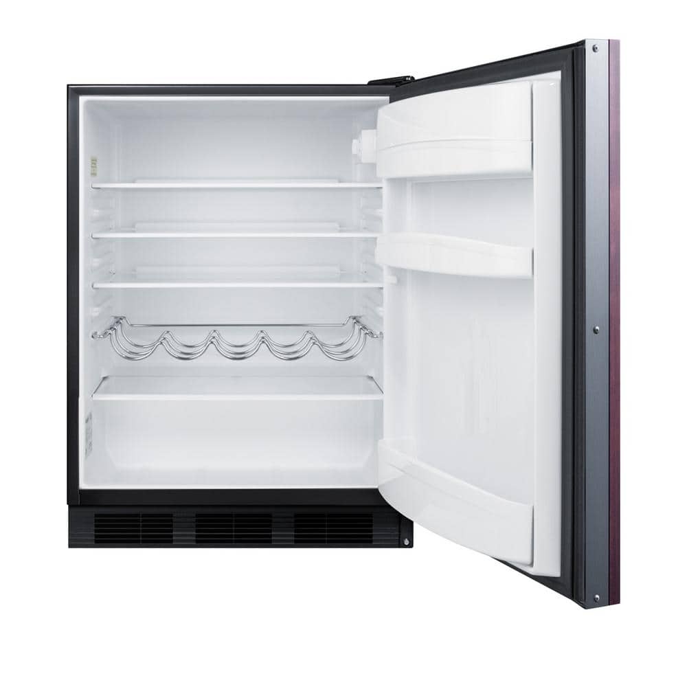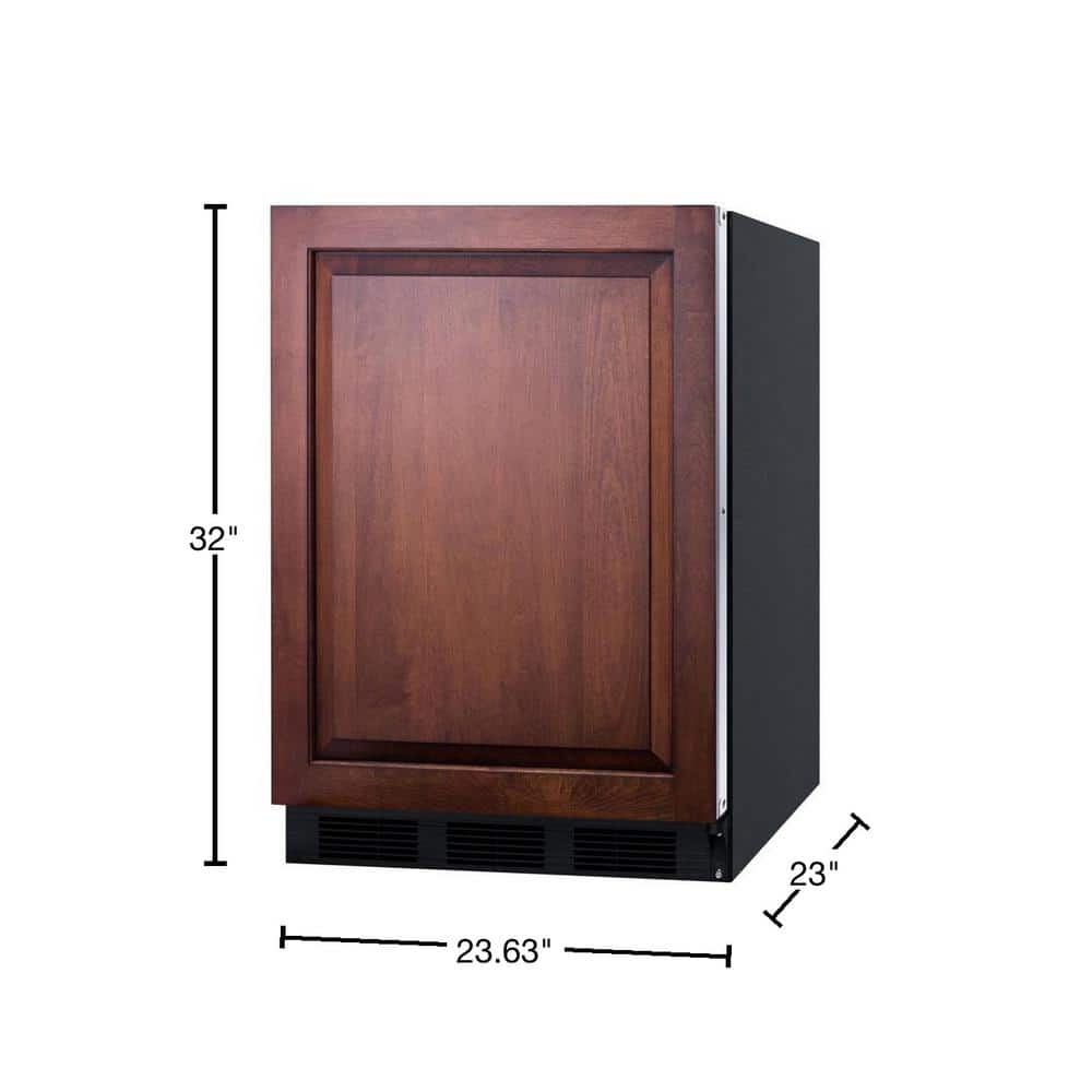 Summit offers the industry's largest selection of ADA compliant built-in undercounter refrigeration, with a range of choices to best meet the needs of any home or facility with height limitations. Sized with a 24 in. footprint and 32 in. height, the AR5BIF is an all-refrigerator with a front-breathing system that allows built-in installation under lower ADA compliant counters. The fully finished cabinet also enables freestanding use. This model comes with a black cabinet finish. The door includes an integrated stainless steel frame designed to accept full overlay panels, allowing you to create a custom look that blends into your own cabinetry. Customers provide their own handle. Panels should be sized at 23-5/16 in. W x 28-1/4 in. H and at least 3/4 in. thick. Inside, the AR5BIF utilizes automatic defrost operation to ensure minimum user maintenance. The 5.5 cu. ft. interior offers more storage space than most models in this size class. Adjustable glass shelves ensure spill-proof storage, with a removable scalloped wine shelf ideal for keeping bottles in place. The door includes three storage racks for condiments and tall bottles. The white interior offers easy visibility, with an automatic light included. The AR5BIF features Summit's intuitive dial thermostat for easy temperature management. Designed and constructed in Europe, the AR5BIF brings reliable cold storage to any setting in need of a quality refrigerator in an ADA compliant height.