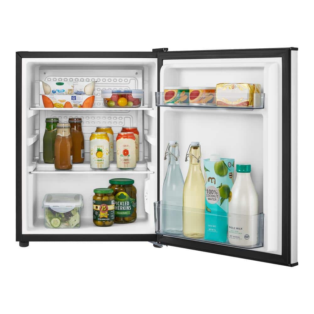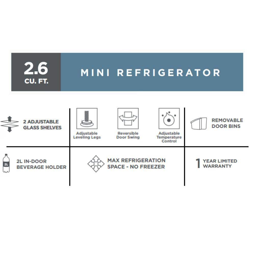 Vissani 2.6 cu. ft. Mini Refrigerator has the storage options you're looking for. It is a freezer-less design which allows for more usable fresh food and drink storage capacity. The sleek appearance is matched by its well-designed interior, which includes a can holder to conveniently keep canned beverages in the door, while additional door shelves provide space for other frequently used items. Its 2-glass shelves are easy to clean and the Energy star qualified design helps save on energy costs without sacrificing performance. Perfect compact size for use in dorm rooms, offices, basements, rec/playrooms, break rooms.