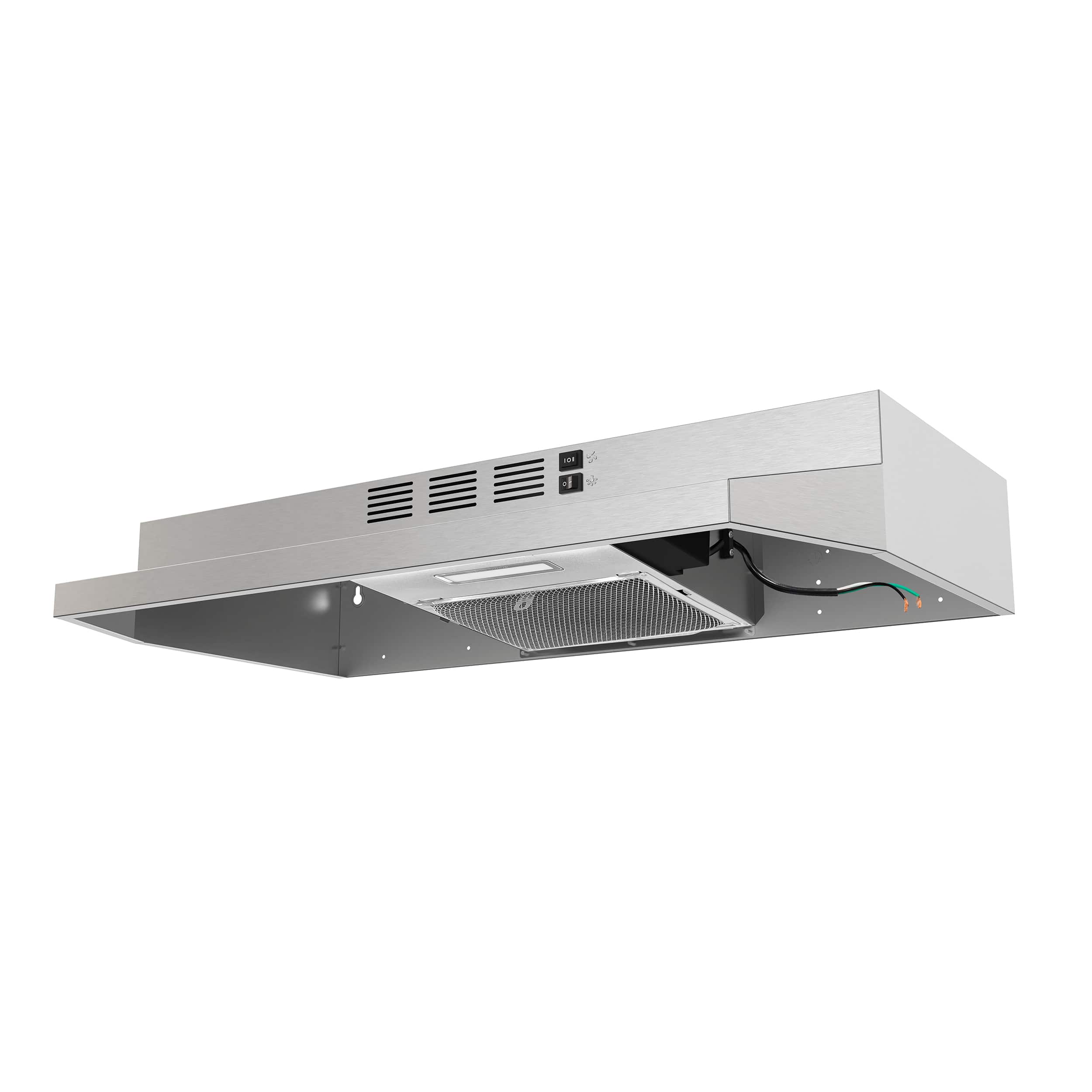 The Forno Cappa 30" Under Cabinet Convertible Range Hood in stainless steel blends powerful performance with a compact, sleek design, ideal for small kitchens and apartments. Featuring a 2-speed exhaust fan, it effectively removes smoke and odors while operating quietly at 54 dB. The unit offers flexible installation with both ducted and ductless options, complete with dishwasher-safe aluminum mesh filters and a carbon filter for enhanced air quality. Its ultra-slim 4.7" height saves space and fits perfectly under any cabinet. Bright 2W LED lights provide energy-efficient illumination, ensuring clear visibility while cooking. Simple mechanical controls allow easy switching between speeds for customized ventilation. Backed by a 2-year parts and labor warranty, the Forno Cappa range hood is a reliable, stylish choice for any kitchen. Lower the cost of living with Forno.