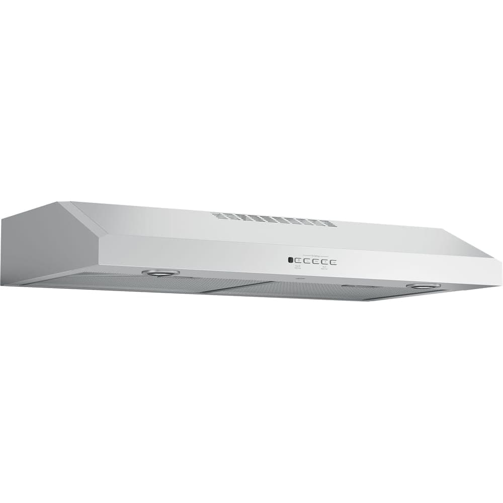 Disperse smoke and kitchen odors with this GE hood. This 36-inch under-the-cabinet system provides four-speed ventilation power to whisk away bad smells, and the electronic backlit controls are easy to use. This GE hood easily installs in just 10 minutes and has dual halogen lights for cooking or nighttime snacking.