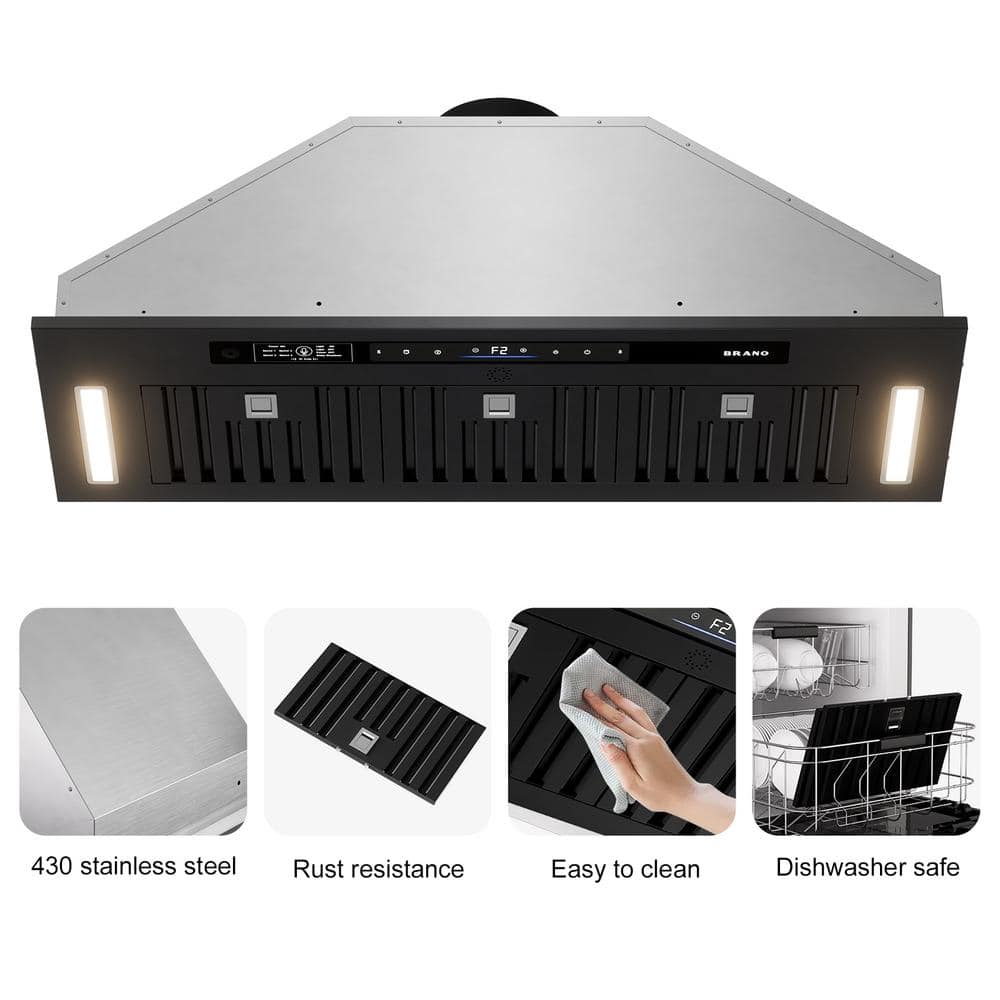 BRANO 36 in. 900 CFM Convertible Insert Range Hood in Black Stainless Steel with Charcoal Filter and LED Lights