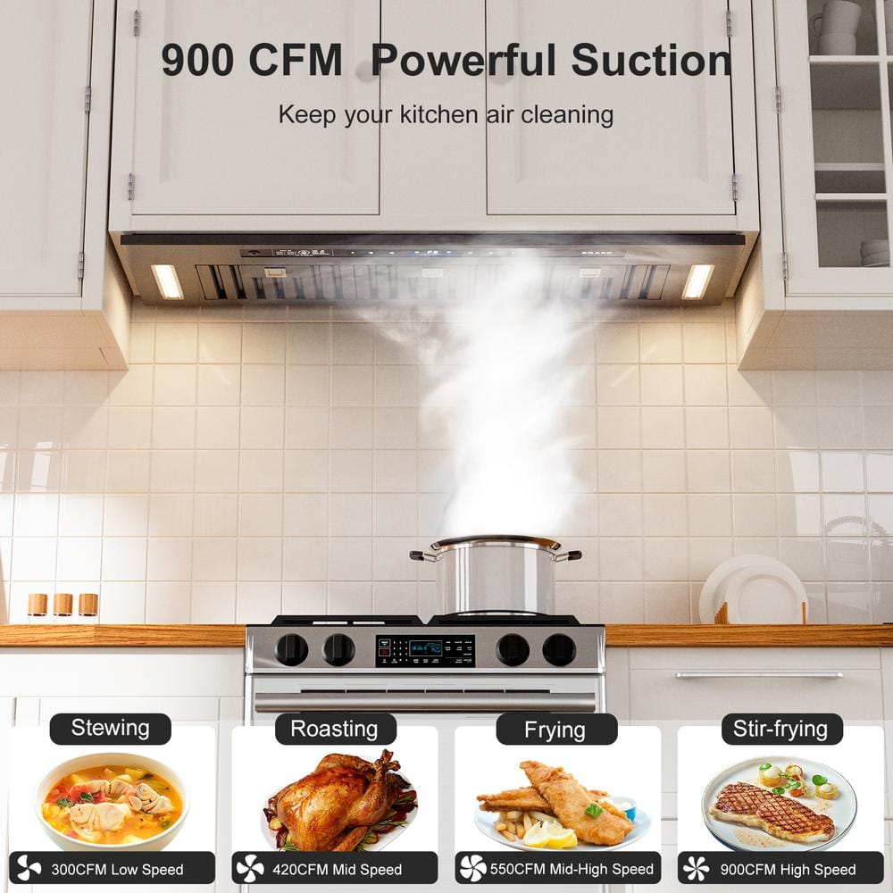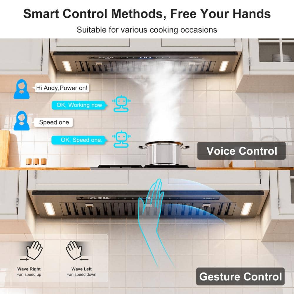 Wall Mount Range Hood with 900 CFM, you can use Voice/Gesture/Touch Control. Our Range Hood with 4-Speed Exhaust Fan. You don't need to reset it every time you operate. Our range hood has a memory function, which is very convenient. Our range hood comes with 2 energy-saving LED lights, which can be easily operated even in dim environments. 900 CFM super suction power is fast smoke exhaust, 60 decibels ultra-quiet, just to give you a better experience.