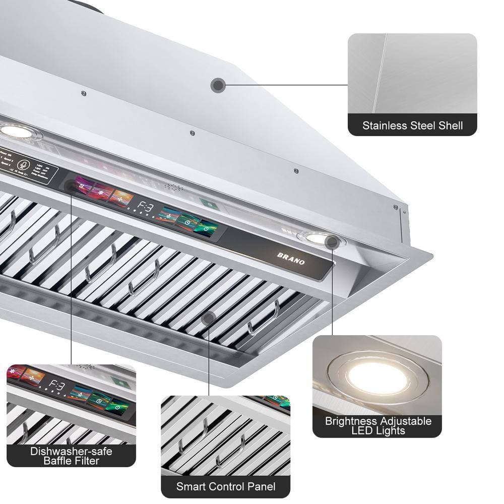 BRANO 36 in. 900 CFM Convertible Insert Range Hood in Stainless Steel with LED Light, 4 Speeds, Voice/Gesture Sensing