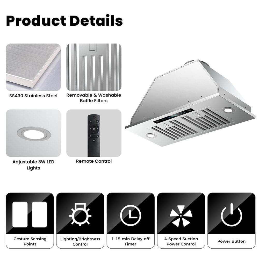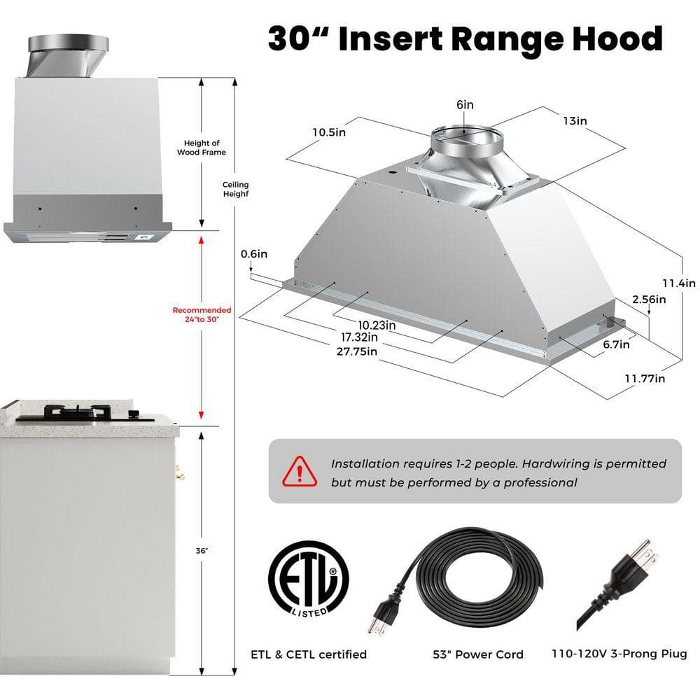 INATECK 30 in. 900 CFM Convertible Insert Range Hood in Stainless Steel 4-Speed with LED, Touch and Gesture Control with Remote