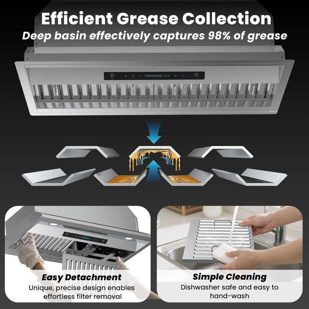 Upgrade your kitchen with the 36-inch 900 CFM Convertible Insert Range Hood, designed to offer superior performance, sleek aesthetics, and quiet operation. With a powerful 900 CFM motor, this range hood effectively removes up to 98% of smoke, steam, and cooking odors, keeping your kitchen fresh and comfortable even during heavy cooking sessions. Whether you're searing, grilling, or frying, this range hood ensures that unwanted fumes are quickly and efficiently eliminated, leaving your space cleaner and more breathable.