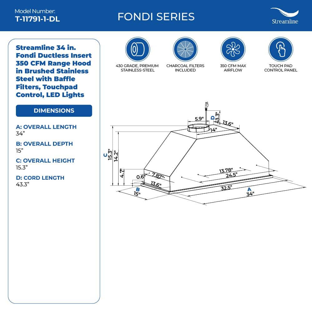 Refresh your kitchen space with the Streamline 34 in. Fondi Ductless Insert Range Hood in Brushed Stainless Steel. Operating at 350 CFM, it features 3-speed touchpad control for smooth ventilation. LED lights enhance the stovetop area, while stainless steel baffle filters ensure clean air. A 3-prong, 120-volt power cord simplifies setup. A perfect addition to any modern kitchen.